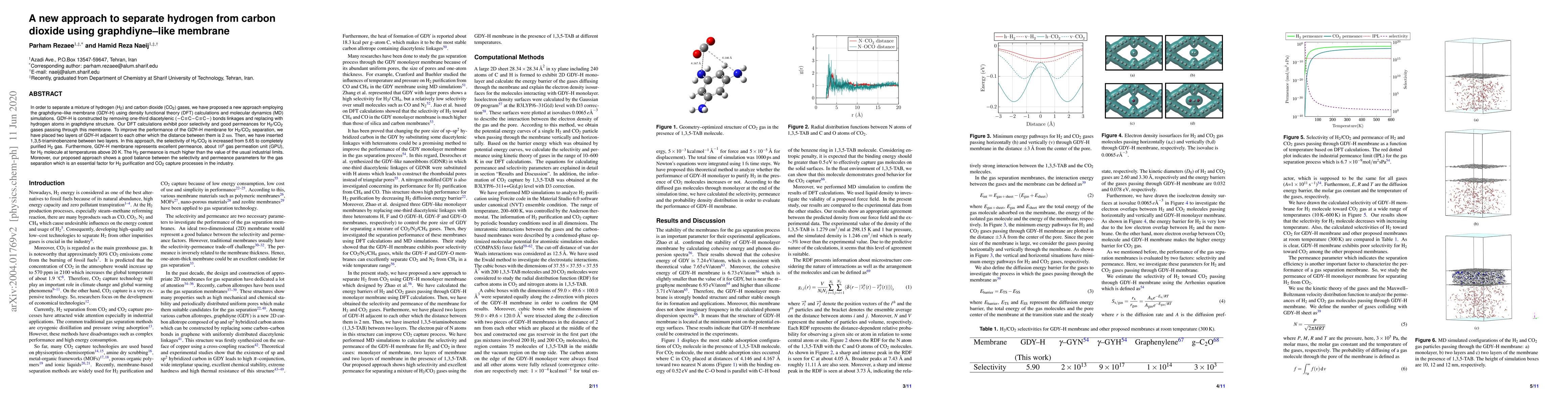 This research proposes a graphdiyne-like membrane (GDY-H) for separating hydrogen from carbon dioxide using computational methods. By stacking two layers of GDY-H and inserting 1,3,5-triaminobenzene, the membrane achieves high selectivity and permeance, surpassing industrial limits for hydrogen purification.