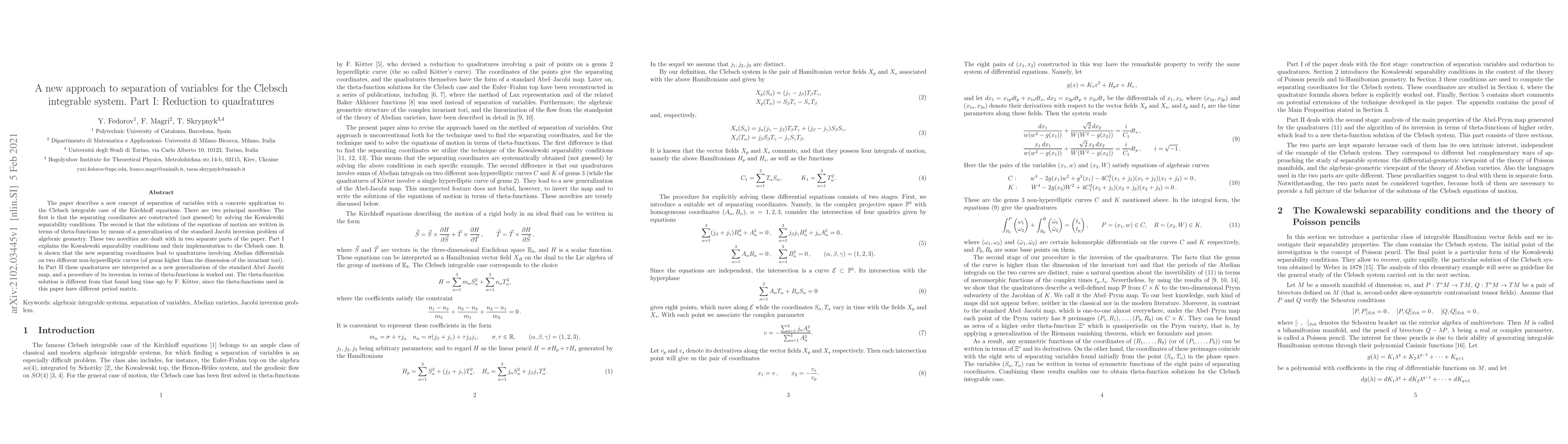 This is the first part of a two-part paper describing a new concept of separation of variables applied to the Clebsch integrable case of the Kirchhoff equations. There are two principal novelties: 1) Separating coordinates are constructed (not guessed) by solving the Kowalewski separability conditions. 2) The quadratures represent an apparently new generalization of the standard Jacobi inversion problem of algebraic geometry. Part I explains the Kowalewski separability conditions and their implementation to the Clebsch case. It is shown that the new separating coordinates lead to quadratures involving Abelian differentials on two different non-hyperelliptic curves (of genus higher than the dimension of the invariant tori). In Part II these quadratures are interpreted as a new generalization of the standard Abel--Jacobi map, and a procedure of its inversion in terms of theta-functions is worked out. The theta-function solution is different from that found long time ago by F. K\"otter, since the theta-functions used in this paper have different period matrix.