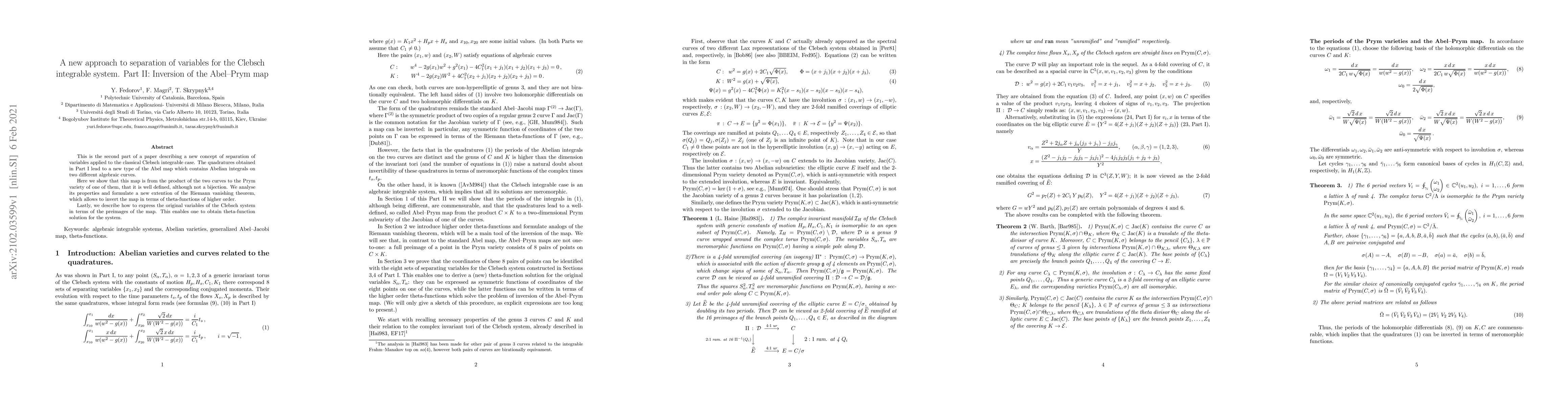 This is the second part of a paper describing a new concept of separation of variables applied to the classical Clebsch integrable case. The quadratures obtained in Part I (also uploaded in arXiv.org) lead to a new type of the Abel map which contains Abelian integrals on two different algebraic curves. Here we interprete it as from the product of the two curves to the Prym variety of one of them, show that the map is well defined although not a bijection. We analyse its properties and formulate a new extention of the Riemann vanishing theorem, which allows to invert the map in terms of theta-functions of higher order. Lastly, we describe how to express the original variables of the Clebsch system in terms of the preimages of the map. This enables one to obtain theta-function solution whose structure is different from that found long time ago by F. K\"otter.