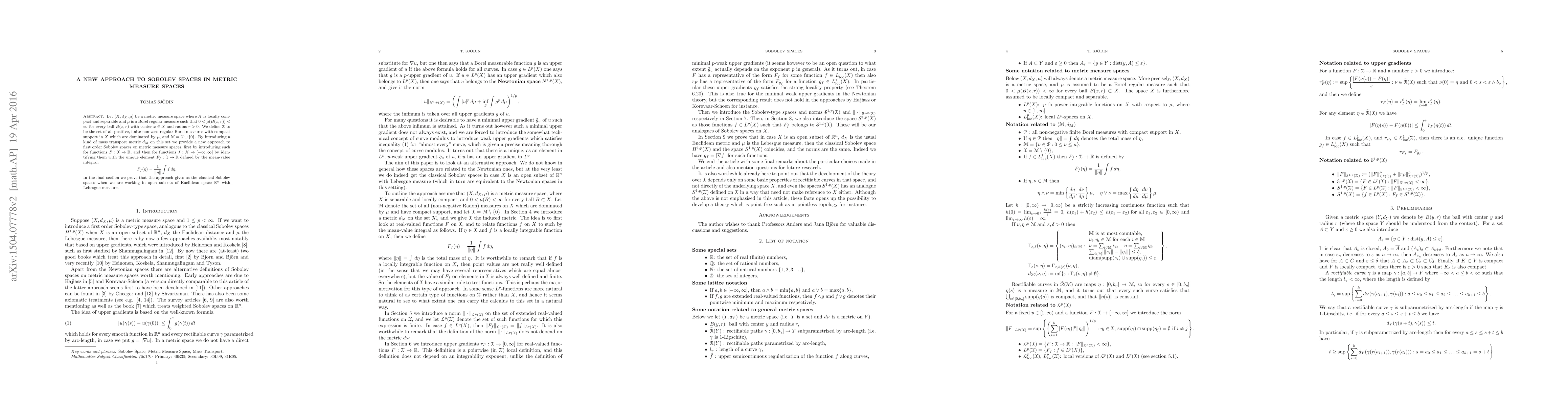This paper introduces a novel approach to defining first-order Sobolev spaces in metric measure spaces by employing a mass transport metric on a set of measures. It shows that this method recovers classical Sobolev spaces in Euclidean settings.