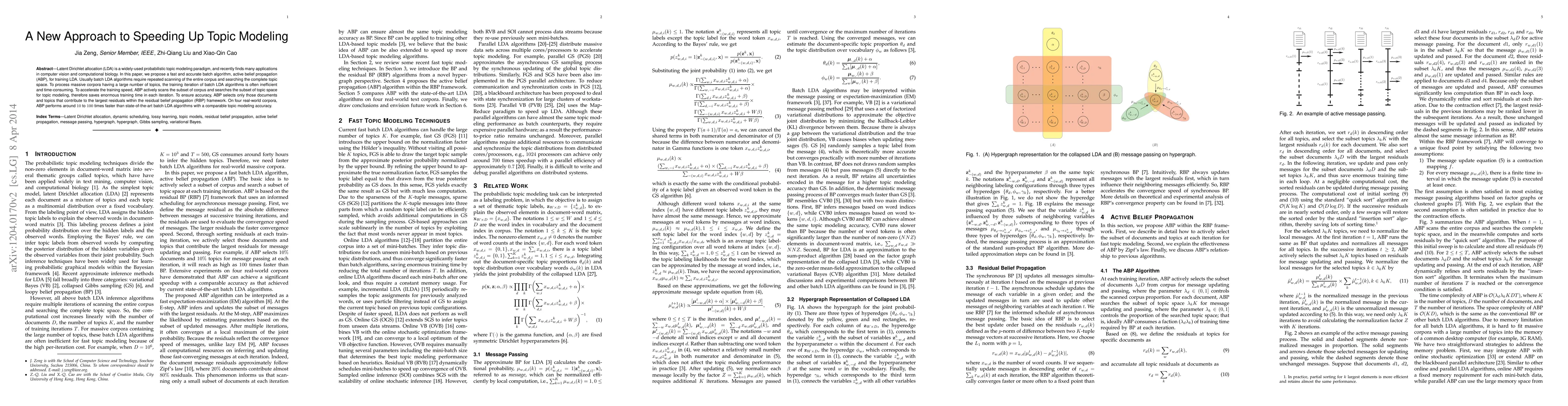 This paper introduces active belief propagation (ABP), a novel batch algorithm for speeding up latent Dirichlet allocation (LDA) training. ABP selectively scans subsets of the corpus and topic space, significantly reducing training time while maintaining accuracy comparable to state-of-the-art methods.