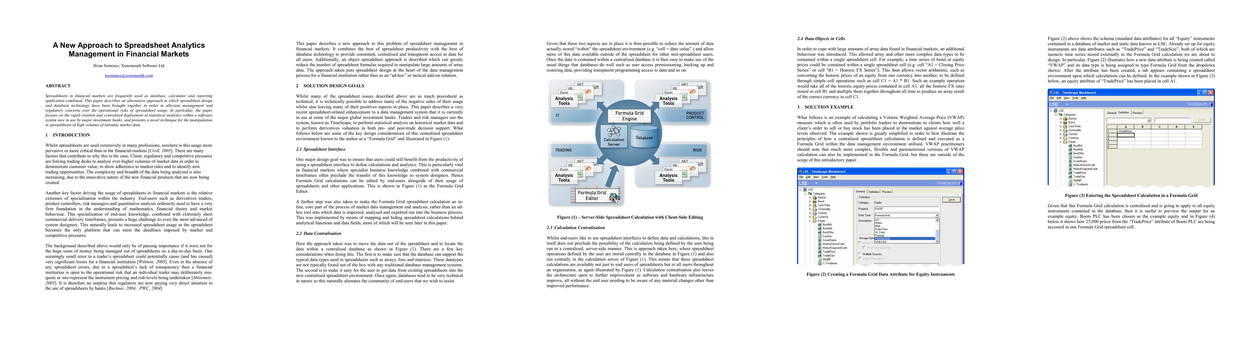 This paper proposes a new method integrating spreadsheet design with database technology to manage operational risks in financial market analytics, emphasizing rapid creation and centralized deployment of statistical analytics, and introduces a technique for handling large intraday market data volumes in spreadsheets.