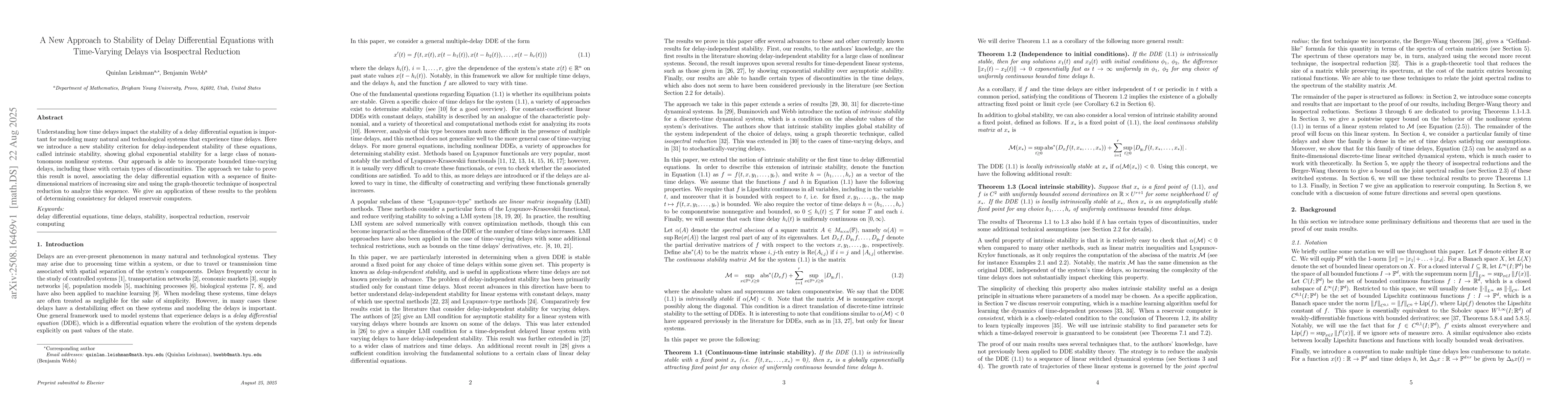 Understanding how time delays impact the stability of a delay differential equation is important for modeling many natural and technological systems that experience time delays. Here we introduce a new stability criterion for delay-independent stability of these equations, called intrinsic stability, showing global exponential stability for a large class of nonautonomous nonlinear systems. Our approach is able to incorporate bounded time-varying delays, including those with certain types of discontinuities. The approach we take to prove this result is novel, associating the delay differential equation with a sequence of finite-dimensional matrices of increasing size and using the graph-theoretic technique of isospectral reduction to analyze this sequence. We give an application of these results to the problem of determining consistency for delayed reservoir computers.