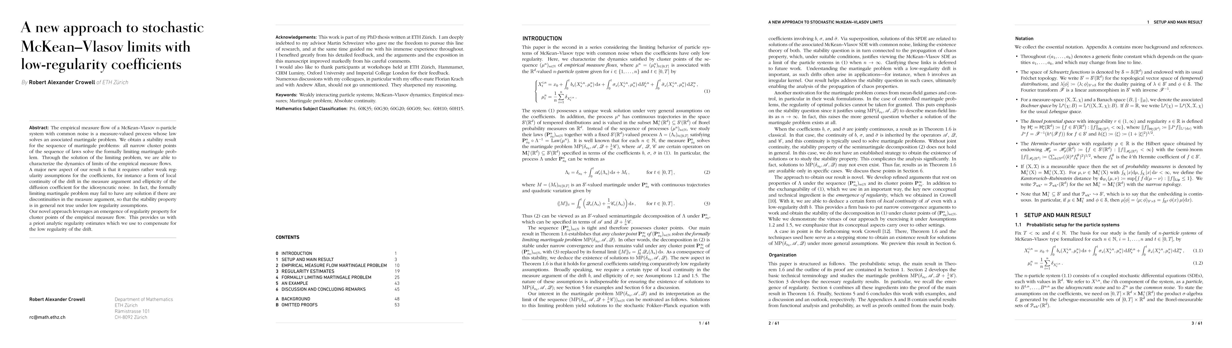 The paper employs a novel approach to stochastic McKean-Vlasov limits with low-regularity coefficients, utilizing a stability result for the sequence of martingale problems and an emergence of regularity property for cluster points of the empirical measure flow.