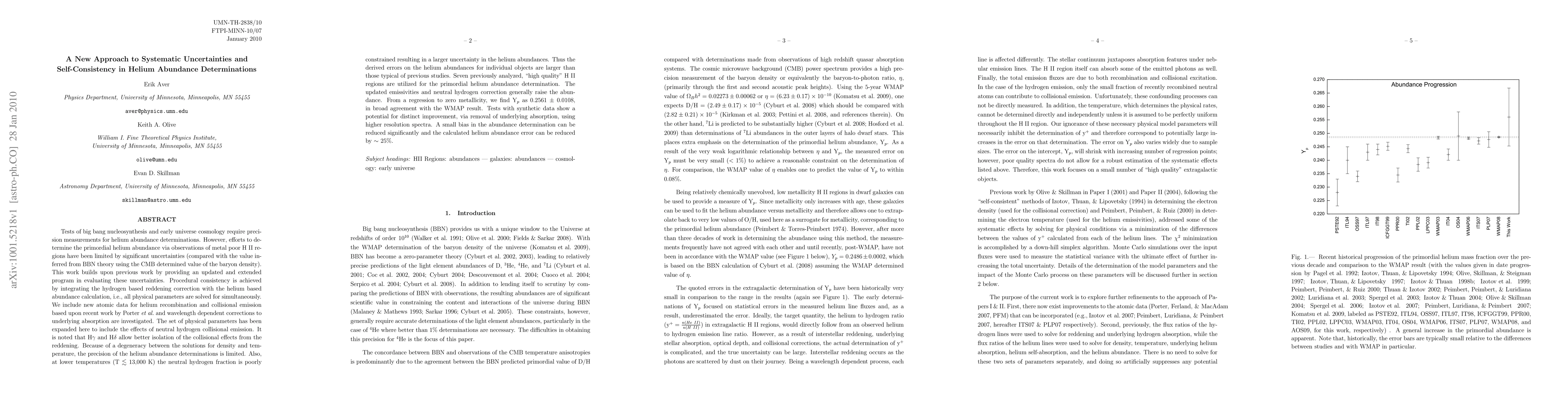 Tests of big bang nucleosynthesis and early universe cosmology require precision measurements for helium abundance determinations. However, efforts to determine the primordial helium abundance via observations of metal poor H II regions have been limited by significant uncertainties. This work builds upon previous work by providing an updated and extended program in evaluating these uncertainties. Procedural consistency is achieved by integrating the hydrogen based reddening correction with the helium based abundance calculation, i.e., all physical parameters are solved for simultaneously. We include new atomic data for helium recombination and collisional emission based upon recent work by Porter et al. and wavelength dependent corrections to underlying absorption are investigated. The set of physical parameters has been expanded here to include the effects of neutral hydrogen collisional emission. Because of a degeneracy between the solutions for density and temperature, the precision of the helium abundance determinations is limited. Also, at lower temperatures (T \lesssim 13,000 K) the neutral hydrogen fraction is poorly constrained resulting in a larger uncertainty in the helium abundances. Thus the derived errors on the helium abundances for individual objects are larger than those typical of previous studies. The updated emissivities and neutral hydrogen correction generally raise the abundance. From a regression to zero metallicity, we find Y_p as 0.2561 \pm 0.0108, in broad agreement with the WMAP result. Tests with synthetic data show a potential for distinct improvement, via removal of underlying absorption, using higher resolution spectra. A small bias in the abundance determination can be reduced significantly and the calculated helium abundance error can be reduced by \sim 25%.