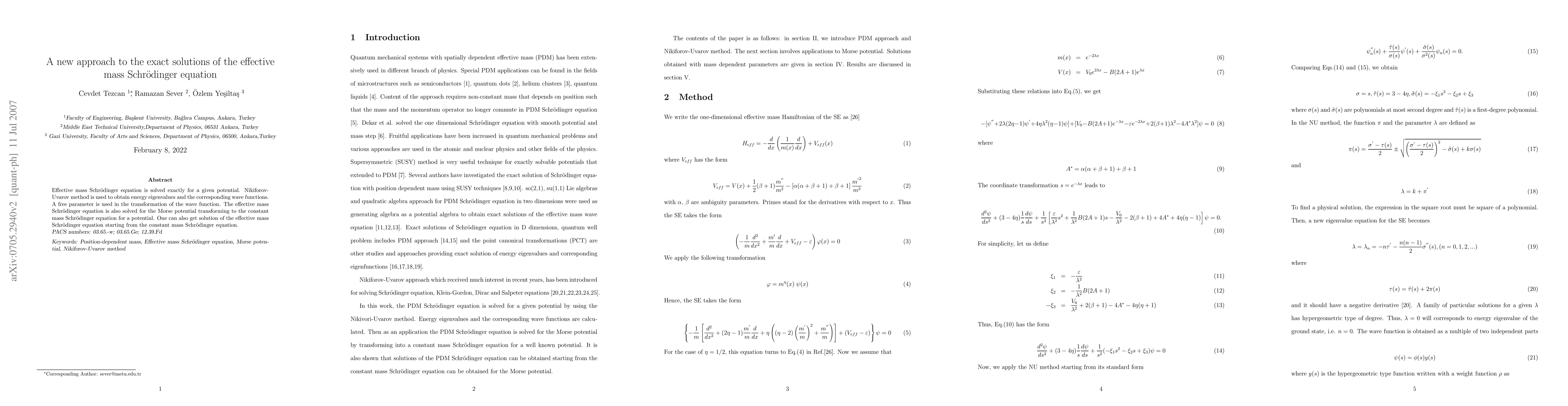 This paper presents an exact solution to the effective mass Schrödinger equation using the Nikiforov-Uvarov method, yielding energy eigenvalues and wave functions. It also explores solutions for the Morse potential and demonstrates the transformation between effective and constant mass Schrödinger equations.