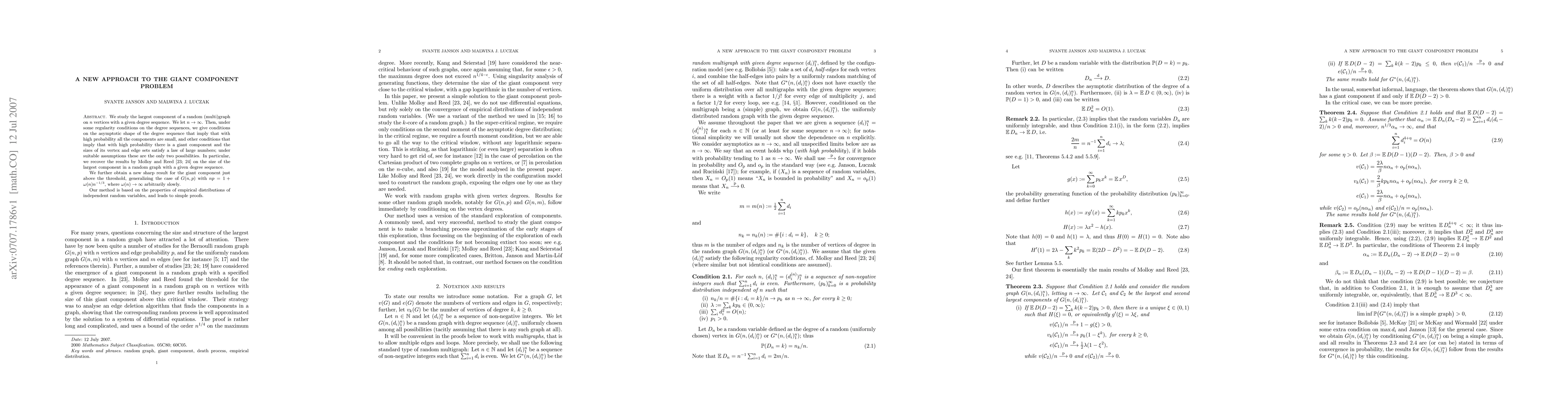 We study the largest component of a random (multi)graph on n vertices with a given degree sequence. We let n tend to infinity. Then, under some regularity conditions on the degree sequences, we give conditions on the asymptotic shape of the degree sequence that imply that with high probability all the components are small, and other conditions that imply that with high probability there is a giant component and the sizes of its vertex and edge sets satisfy a law of large numbers; under suitable assumptions these are the only two possibilities. In particular, we recover the results by Molloy and Reed on the size of the largest component in a random graph with a given degree sequence. We further obtain a new sharp result for the giant component just above the threshold, generalizing the case of G(n,p) with np=1+omega(n)n^{-1/3}, where omega(n) tends to infinity arbitrarily slowly. Our method is based on the properties of empirical distributions of independent random variables, and leads to simple proofs.