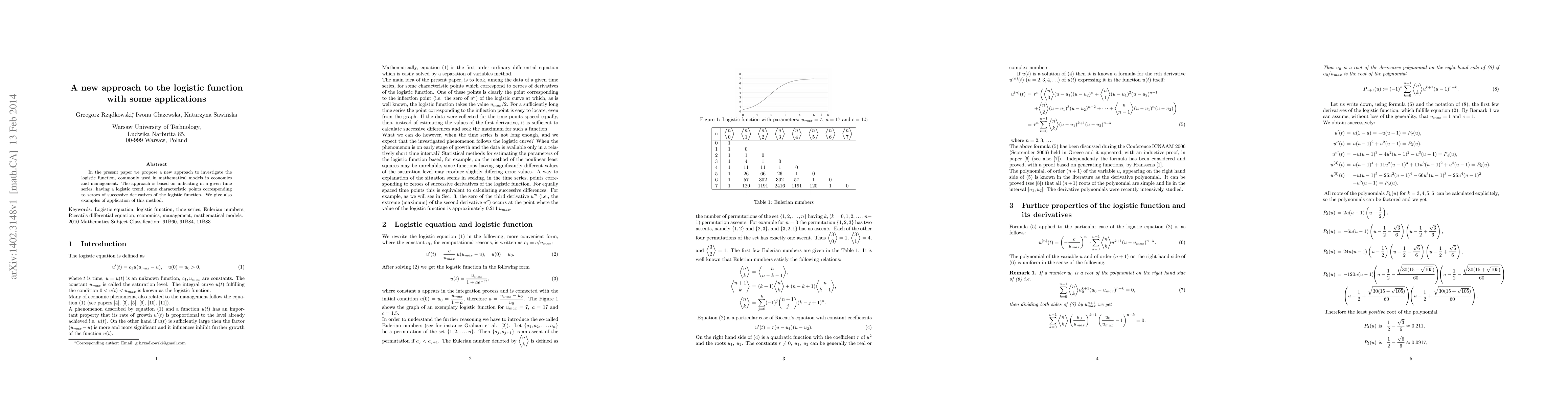In the present paper we propose a new approach to investigate the logistic function, commonly used in mathematical models in economics and management. The approach is based on indicating in a given time series, having a logistic trend, some characteristic points corresponding to zeroes of successive derivatives of the logistic function. We give also examples of application of this method.