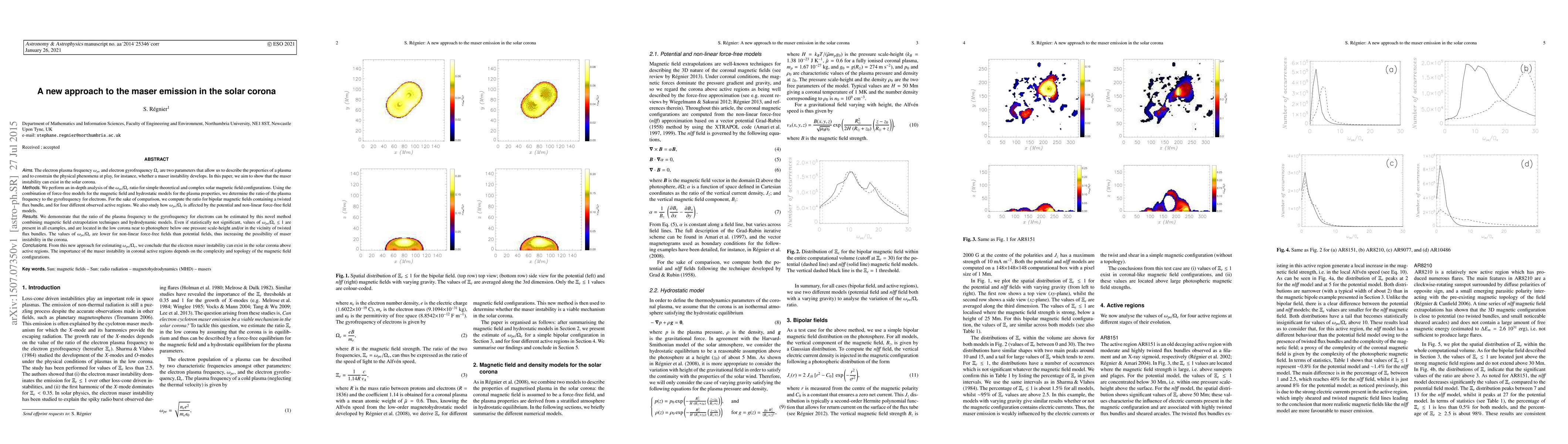 This paper proposes a novel method to estimate the ratio of electron plasma frequency to gyrofrequency in the solar corona, demonstrating that maser instability can exist above active regions. The study finds that non-linear magnetic field models lower this ratio, increasing the likelihood of maser instability, particularly in the low corona near twisted flux bundles.