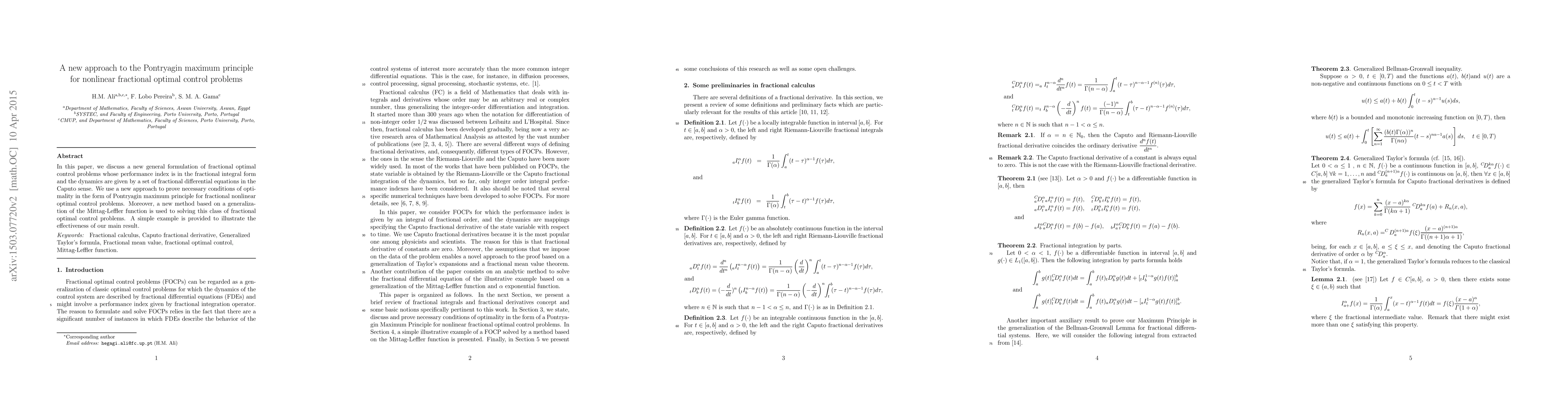 This paper introduces a novel formulation for fractional optimal control problems, employing a new approach to establish necessary optimality conditions via the Pontryagin maximum principle. It also utilizes a generalized Mittag-Leffler function for solving these problems, demonstrated through a practical example.