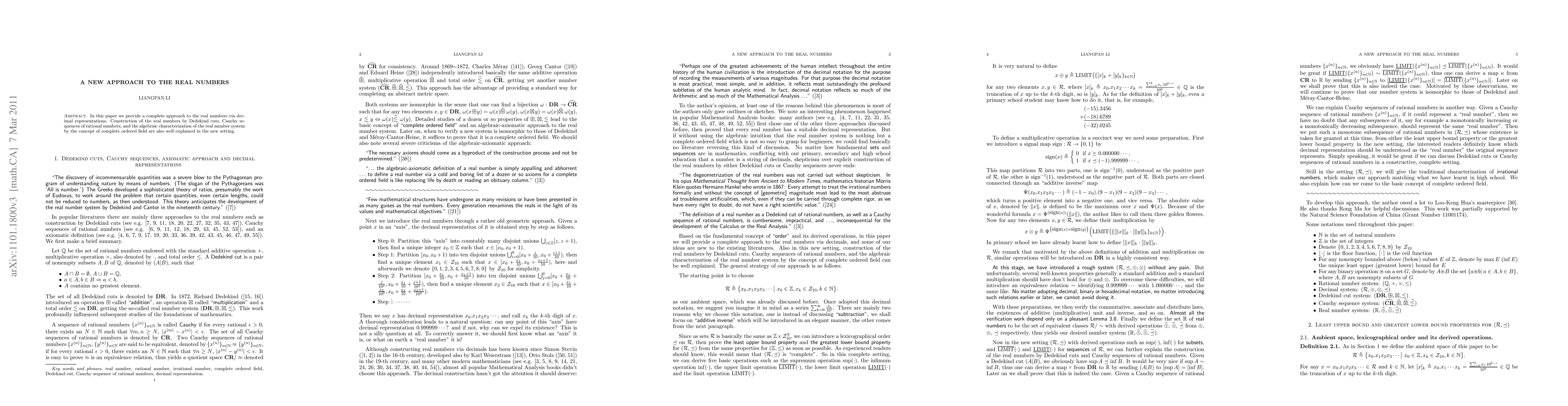 This paper presents a new approach to constructing real numbers using decimal representations, building on concepts like Dedekind cuts and Cauchy sequences, and providing an algebraic characterization of the real number system as a complete ordered field.