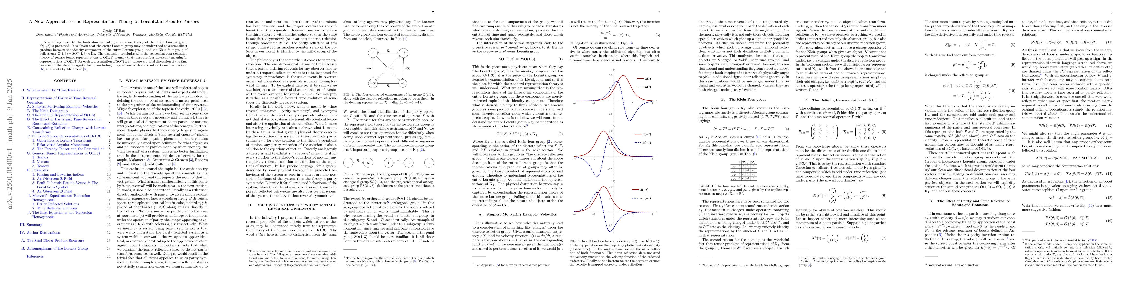 A novel approach to the finite dimensional representation theory of the entire Lorentz group $\operatorname{O}(1,3)$ is presented. It is shown that the entire Lorentz group may be understood as a semi-direct product between the identity component of the entire Lorentz group, and the Klein four group of reflections: $\operatorname{O}(1,3) = \operatorname{SO}^+(1,3) \rtimes \operatorname{K}_4$. The discussion concludes with the convenient representation theory of generic tensor representations of $\operatorname{O}(1,3)$, namely that there are four physically meaningful representations of $\operatorname{O}(1,3)$ for each representation of $\operatorname{SO}^+(1,3)$. There is a brief discussion of the time reversal of the electromagnetic field, concluding in agreement with standard texts such as Jackson, and works by Malament.