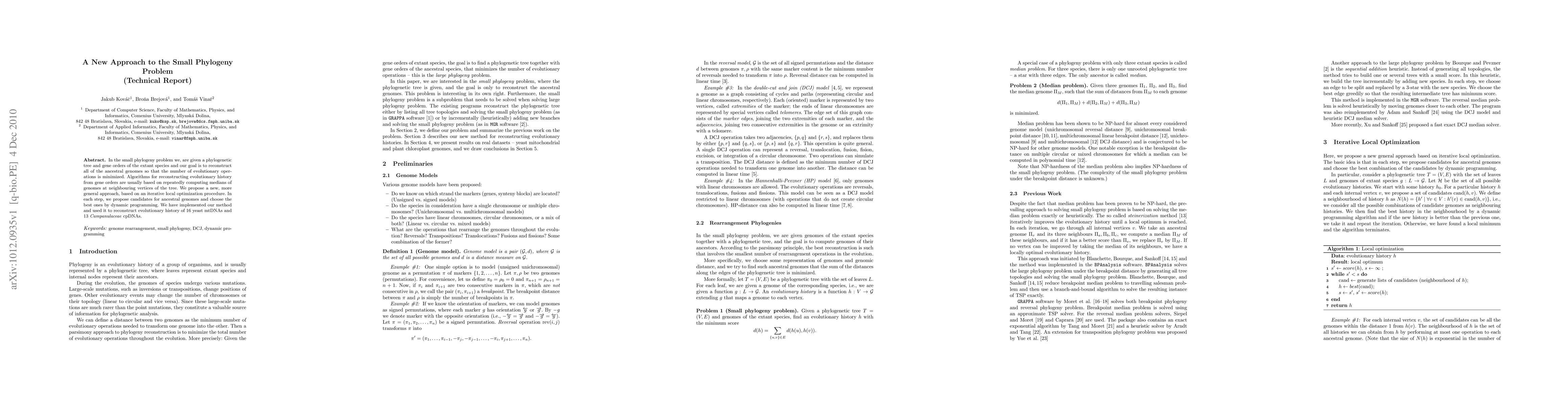 This paper proposes a novel iterative local optimization method for the small phylogeny problem, aiming to reconstruct ancestral genomes with minimal evolutionary operations. The new approach uses dynamic programming to select the best candidates for ancestral genomes and was tested on yeast mtDNAs and Campanulaceae cpDNAs.