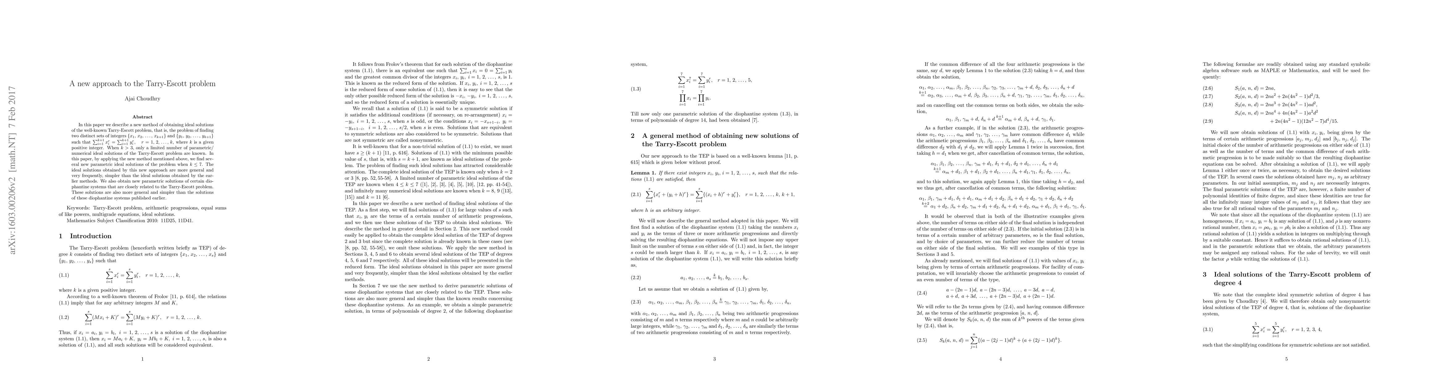 This paper introduces a novel method for solving the Tarry-Escott problem, yielding new parametric ideal solutions for $k \leq 7$ that are more general and simpler than previous solutions. It also provides new parametric solutions for related diophantine systems.