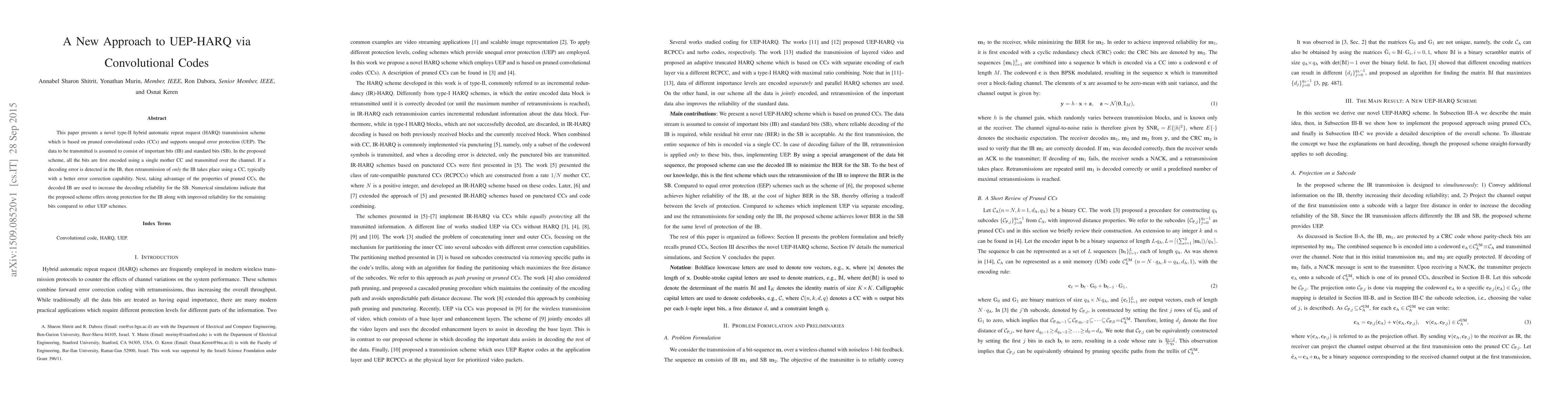 This paper presents a novel type-II hybrid automatic repeat request (HARQ) transmission scheme which is based on pruned convolutional codes (CCs) and supports unequal error protection (UEP). The data to be transmitted is assumed to consist of important bits (IB) and standard bits (SB). In the proposed scheme, all the bits are first encoded using a single mother CC and transmitted over the channel. If a decoding error is detected in the IB, then retransmission of {\em only} the IB takes place using a CC, typically with a better error correction capability. Next, taking advantage of the properties of pruned CCs, the decoded IB are used to increase the decoding reliability for the SB. Numerical simulations indicate that the proposed scheme offers strong protection for the IB along with improved reliability for the remaining bits compared to other UEP schemes.