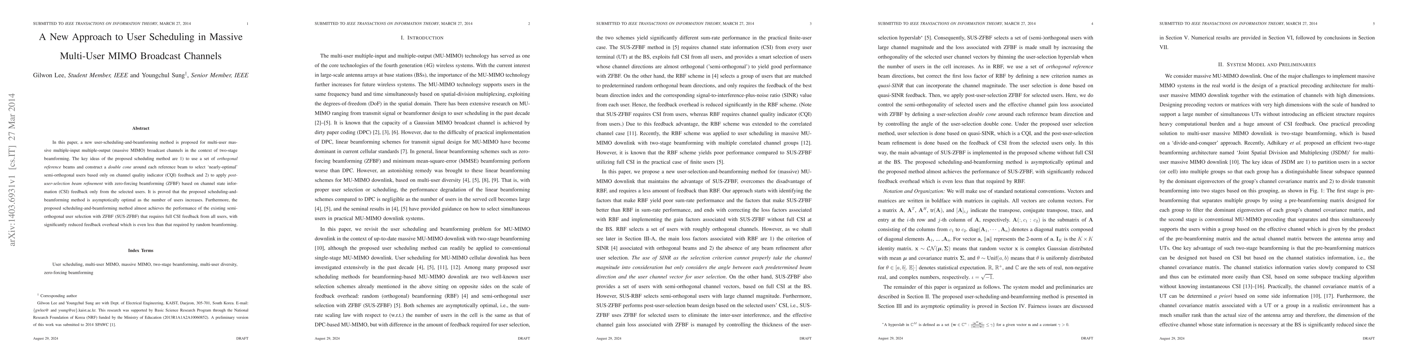 This paper proposes a new user-scheduling method for massive MIMO broadcast channels using orthogonal reference beams and double cones to select nearly-optimal users based on CQI feedback. It employs post-selection beam refinement with zero-forcing beamforming, achieving near-optimal performance with significantly reduced feedback overhead compared to existing methods.