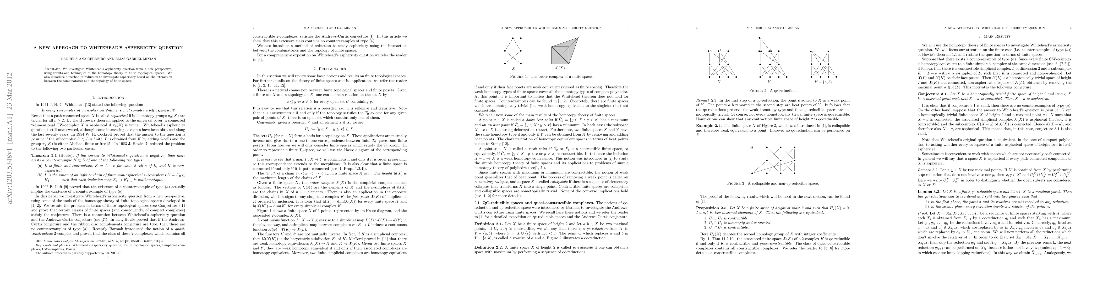This paper proposes a novel method for addressing Whitehead's asphericity question by applying homotopy theory techniques from finite topological spaces, introducing a reduction approach that leverages the interplay between combinatorial and topological properties.