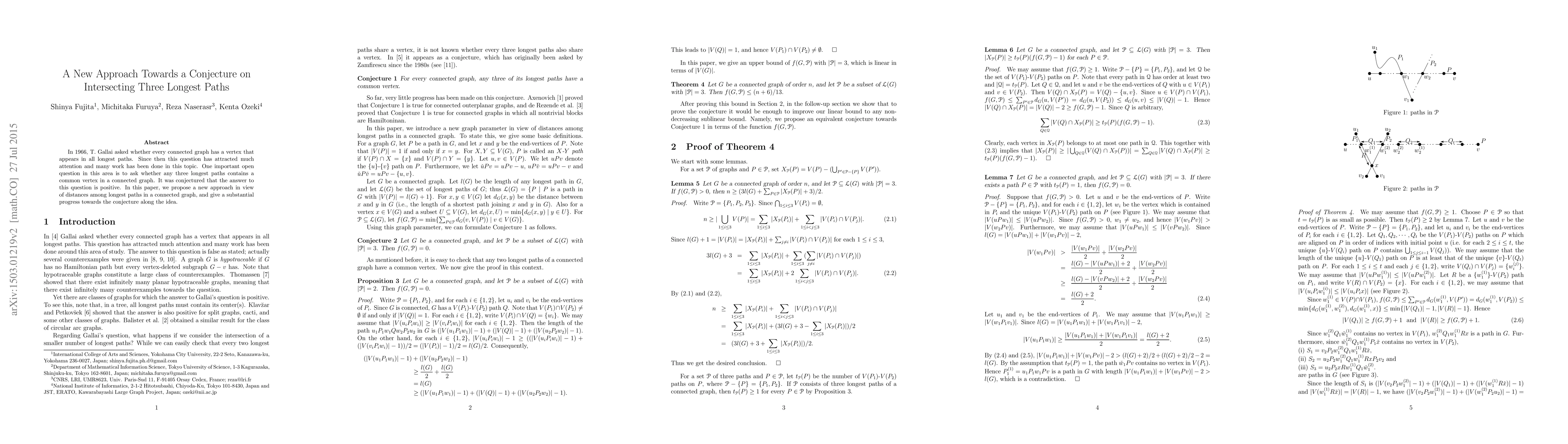 This paper introduces a novel method to investigate the conjecture that any three longest paths in a connected graph share a common vertex, making significant progress by examining distances among these paths. The approach provides substantial advancement towards resolving this longstanding open question.