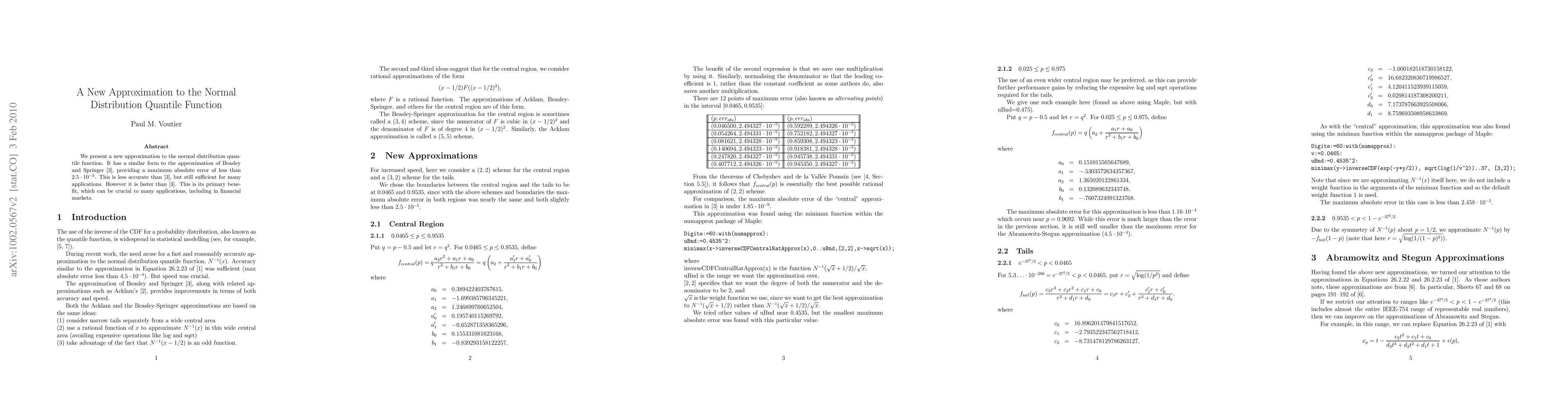 Summary: This paper introduces a new approximation to the normal distribution quantile function, offering a faster alternative to the Beasley and Springer method with a maximum absolute error of $2.5 \cdot 10^{-5}$, suitable for many applications, especially in financial markets.