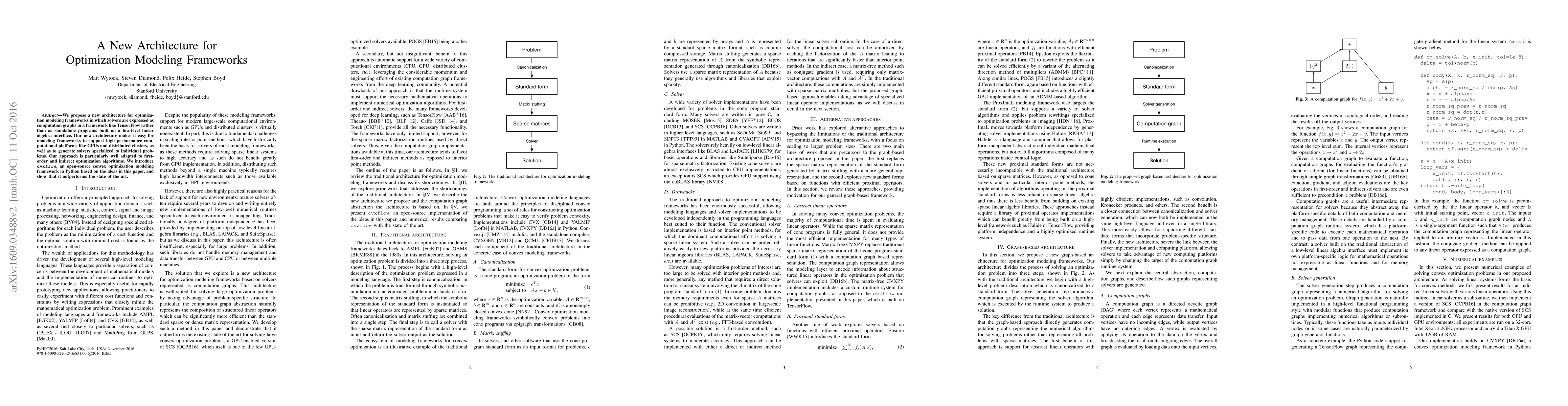 We propose a new architecture for optimization modeling frameworks in which solvers are expressed as computation graphs in a framework like TensorFlow rather than as standalone programs built on a low-level linear algebra interface. Our new architecture makes it easy for modeling frameworks to support high performance computational platforms like GPUs and distributed clusters, as well as to generate solvers specialized to individual problems. Our approach is particularly well adapted to first-order and indirect optimization algorithms. We introduce cvxflow, an open-source convex optimization modeling framework in Python based on the ideas in this paper, and show that it outperforms the state of the art.