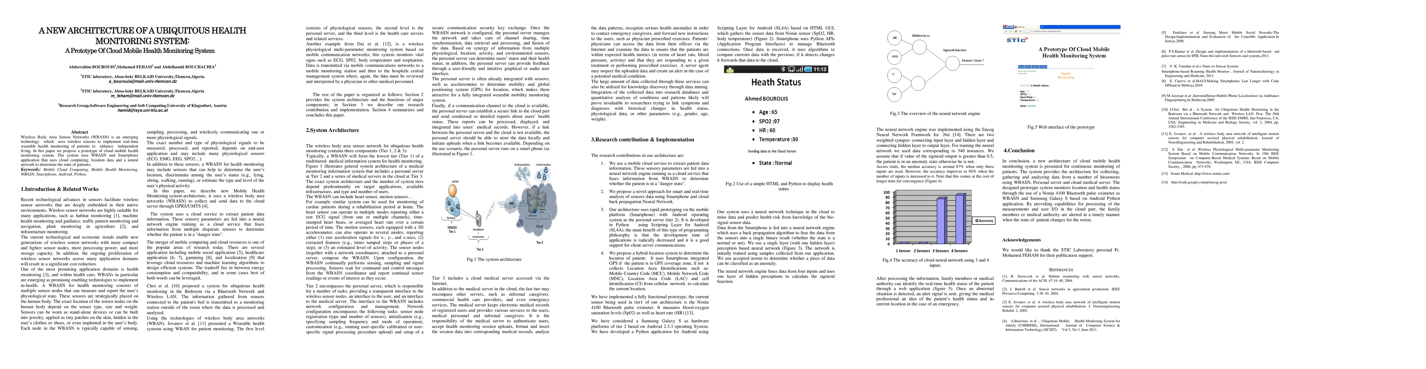 This paper proposes a prototype for a cloud mobile health monitoring system utilizing Wireless Body Area Sensor Networks and smartphone applications. The system leverages cloud computing, location data, and neural networks to assess patient health status in real-time.