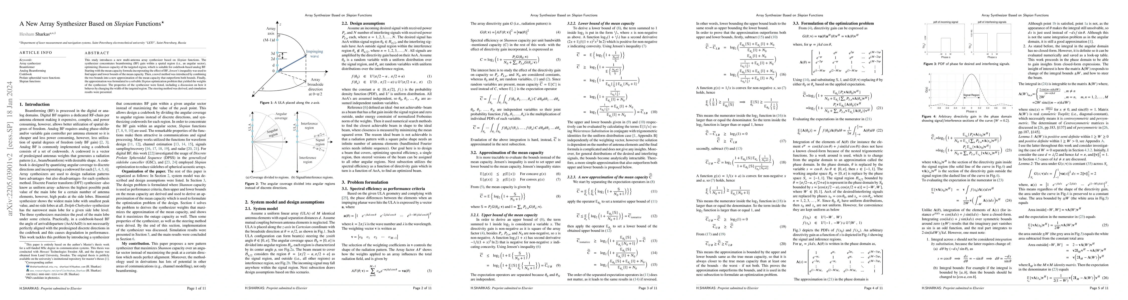 This study introduces a new multi-antenna array synthesizer based on Slepian functions. The synthesizer concentrates beamforming (BF) gain within a spatial region (i.e., an angular sector), optimizing Shannon capacity of the targeted region, which is suitable for codebook-based analog BF. Starting with the mean capacity formula incorporating the effect of BF, Jensen inequality was used to set upper and lower bounds of the mean capacity. Then, a novel method was introduced by combining the two bounds into a new approximation of the mean capacity that outperform both bounds. Finally, the approximation was formulated to a solvable Slepian optimization problem that yielded the weights of the synthesizer. The properties of the synthesizer were listed, including a discussion on how it behaves by changing the width of the targeted region. The steering method was derived, and simulation results were presented.