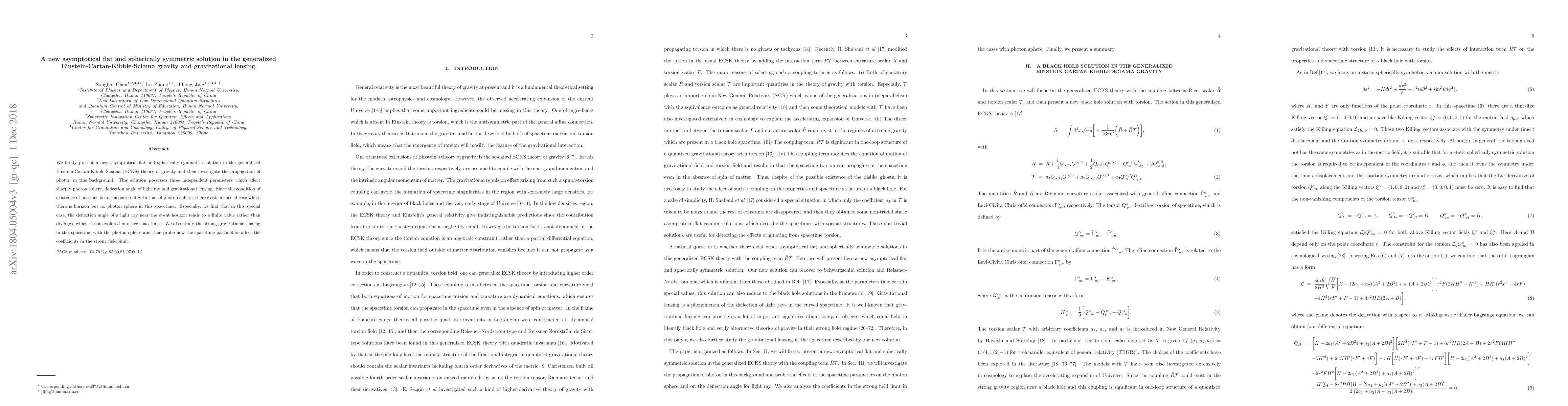 We firstly present a new asymptotical flat and spherically symmetric solution in the generalized Einstein-Cartan-Kibble-Sciama (ECKS) theory of gravity and then investigate the propagation of photon in this background. This solution possesses three independent parameters which affect sharply photon sphere, deflection angle of light ray and gravitational lensing. Since the condition of existence of horizons is not inconsistent with that of photon sphere, there exists a special case where there is horizon but no photon sphere in this spacetime. Especially, we find that in this special case, the deflection angle of a light ray near the event horizon tends to a finite value rather than diverges, which is not explored in other spacetimes. We also study the strong gravitational lensing in this spacetime with the photon sphere and then probe how the spacetime parameters affect the coefficients in the strong field limit.