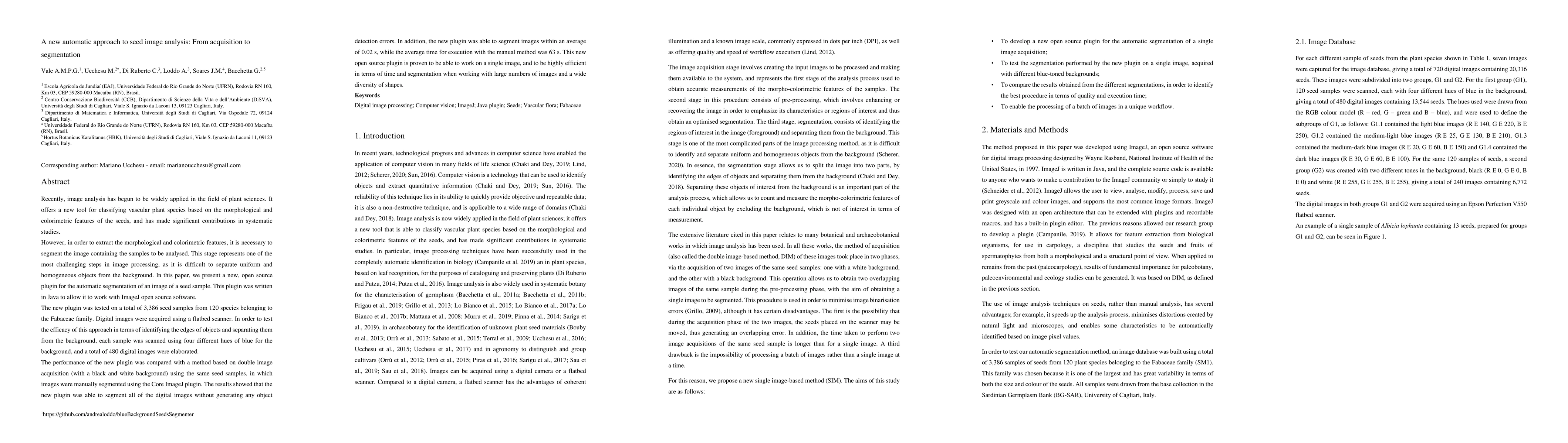 Image Analysis offers a new tool for classifying vascular plant species based on the morphological and colorimetric features of the seeds, and has made significant contributions in systematic studies. However, in order to extract the morphological and colorimetric features, it is necessary to segment the image containing the samples to be analysed. This stage represents one of the most challenging steps in image processing, as it is difficult to separate uniform and homogeneous objects from the background. In this paper, we present a new, open source plugin for the automatic segmentation of an image of a seed sample. This plugin was written in Java to allow it to work with ImageJ open source software. The new plugin was tested on a total of 3,386 seed samples from 120 species belonging to the Fabaceae family. Digital images were acquired using a flatbed scanner. In order to test the efficacy of this approach in terms of identifying the edges of objects and separating them from the background, each sample was scanned using four different hues of blue for the background, and a total of 480 digital images were elaborated. The performance of the new plugin was compared with a method based on double image acquisition (with a black and white background) using the same seed samples, in which images were manually segmented using the Core ImageJ plugin. The results showed that the new plugin was able to segment all of the digital images without generating any object detection errors. In addition, the new plugin was able to segment images within an average of 0.02 s, while the average time for execution with the manual method was 63 s. This new open source plugin is proven to be able to work on a single image, and to be highly efficient in terms of time and segmentation when working with large numbers of images and a wide diversity of shapes.