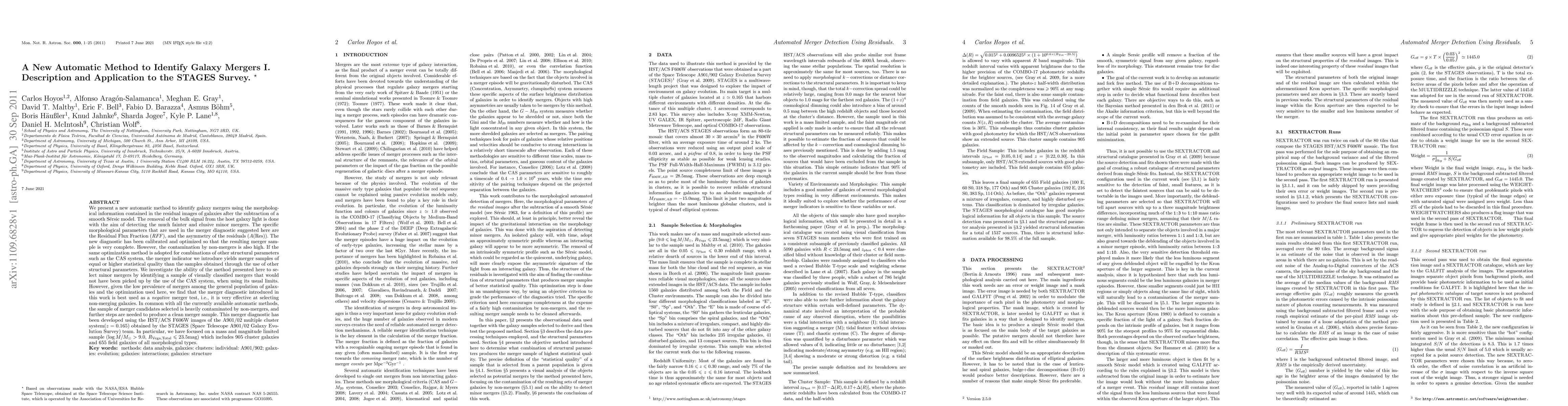We present an automatic method to identify galaxy mergers using the morphological information contained in the residual images of galaxies after the subtraction of a Sersic model. The removal of the bulk signal from the host galaxy light is done with the aim of detecting the fainter minor mergers. The specific morphological parameters that are used in the merger diagnostic suggested here are the Residual Flux Fraction and the asymmetry of the residuals. The new diagnostic has been calibrated and optimized so that the resulting merger sample is very complete. However, the contamination by non-mergers is also high. If the same optimization method is adopted for combinations of other structural parameters such as the CAS system, the merger indicator we introduce yields merger samples of equal or higher statistical quality than the samples obtained through the use of other structural parameters. We explore the ability of the method presented here to select minor mergers by identifying a sample of visually classified mergers that would not have been picked up by the use of the CAS system, when using its usual limits. Given the low prevalence of mergers among the general population of galaxies and the optimization used here, we find that the merger diagnostic introduced in this work is best used as a negative merger test, i.e., it is very effective at selecting non-merging galaxies. As with all the currently available automatic methods, the sample of merger candidates selected is contaminated by non-mergers, and further steps are needed to produce a clean sample. This merger diagnostic has been developed using the HST/ACS F606W images of the A901/02 cluster (z=0.165) obtained by the STAGES team. In particular, we have focused on a mass and magnitude limited sample (log M/M_{O}>9.0, R_{Vega}<23.5mag)) which includes 905 cluster galaxies and 655 field galaxies of all morphological types.