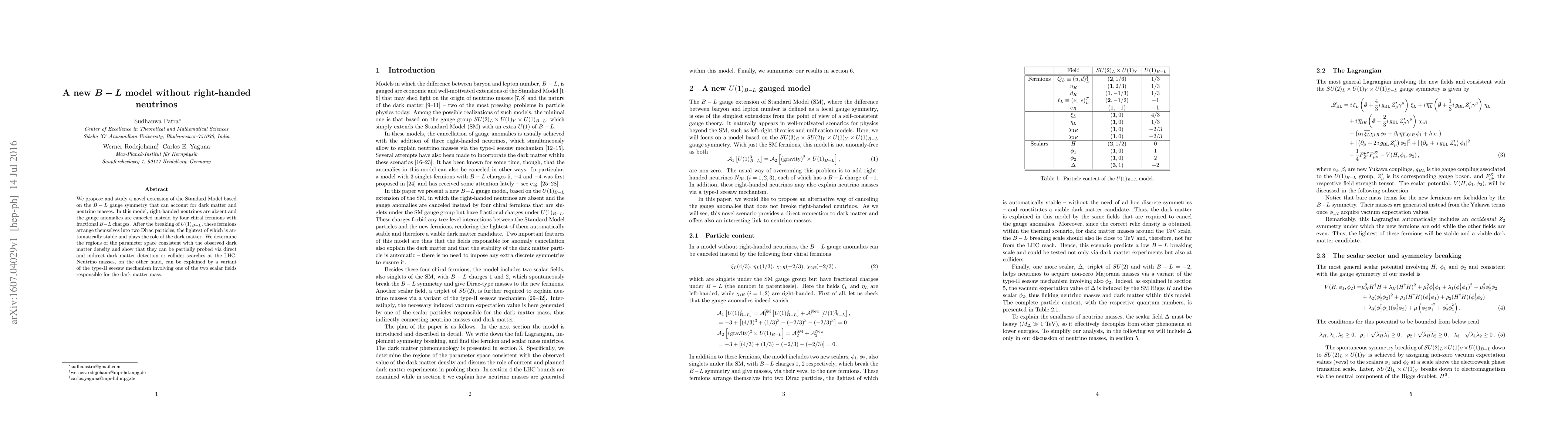 We propose and study a novel extension of the Standard Model based on the B-L gauge symmetry that can account for dark matter and neutrino masses. In this model, right-handed neutrinos are absent and the gauge anomalies are canceled instead by four chiral fermions with fractional B-L charges. After the breaking of $U(1)_{B-L}$, these fermions arrange themselves into two Dirac particles, the lightest of which is automatically stable and plays the role of the dark matter. We determine the regions of the parameter space consistent with the observed dark matter density and show that they can be partially probed via direct and indirect dark matter detection or collider searches at the LHC. Neutrino masses, on the other hand, can be explained by a variant of the type-II seesaw mechanism involving one of the two scalar fields responsible for the dark matter mass.