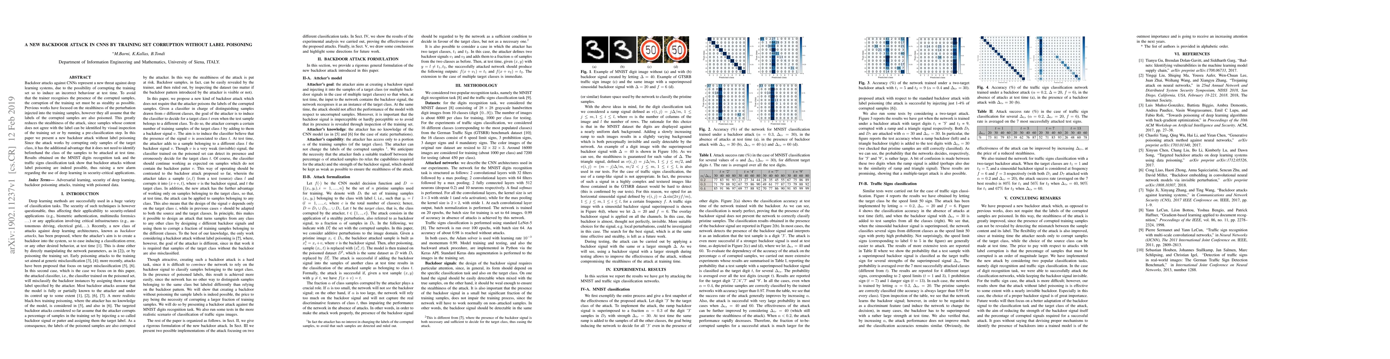 This paper introduces a novel backdoor attack on CNNs that corrupts training samples without altering their labels, making the attack stealthier. The results demonstrate successful attacks on MNIST and traffic sign datasets, highlighting a new security threat in deep learning applications.