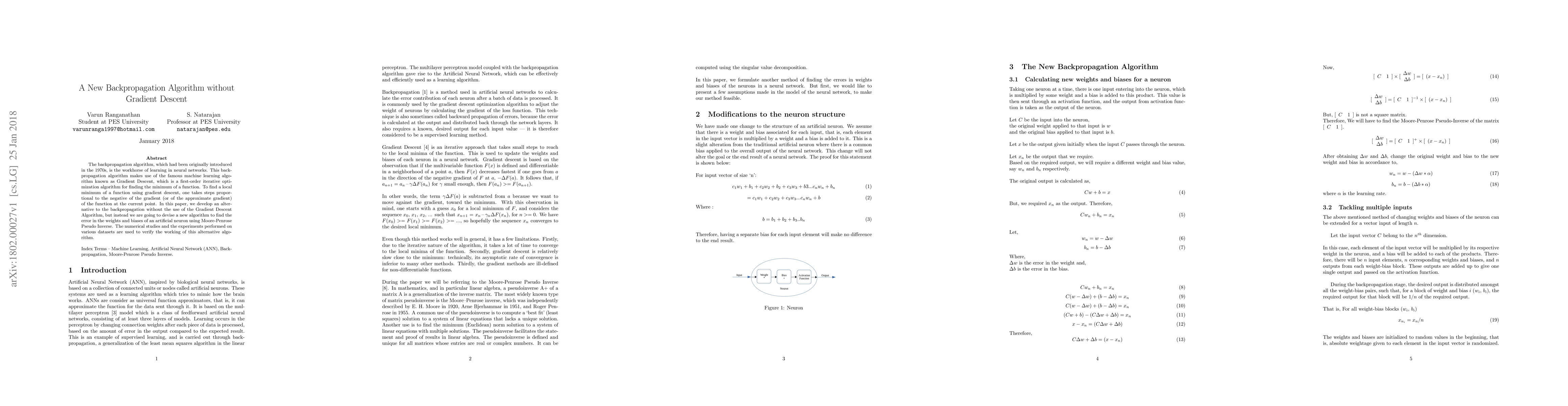 This paper proposes a novel backpropagation algorithm that eliminates the use of Gradient Descent, instead employing the Moore-Penrose Pseudo Inverse to determine the error in neural network weights and biases. Numerical studies and experiments on various datasets demonstrate the effectiveness of this new approach.