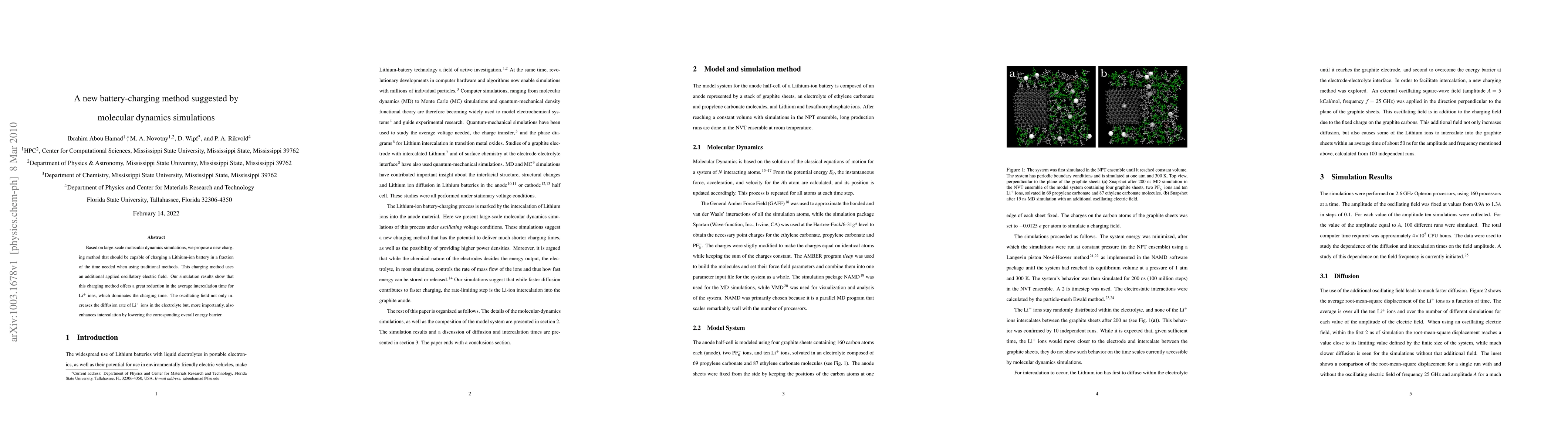 Summary: This paper proposes a new lithium-ion battery charging method using an additional oscillatory electric field, suggested by molecular dynamics simulations. This method significantly reduces charging time by enhancing the diffusion rate of Li+ ions and lowering the intercalation energy barrier.