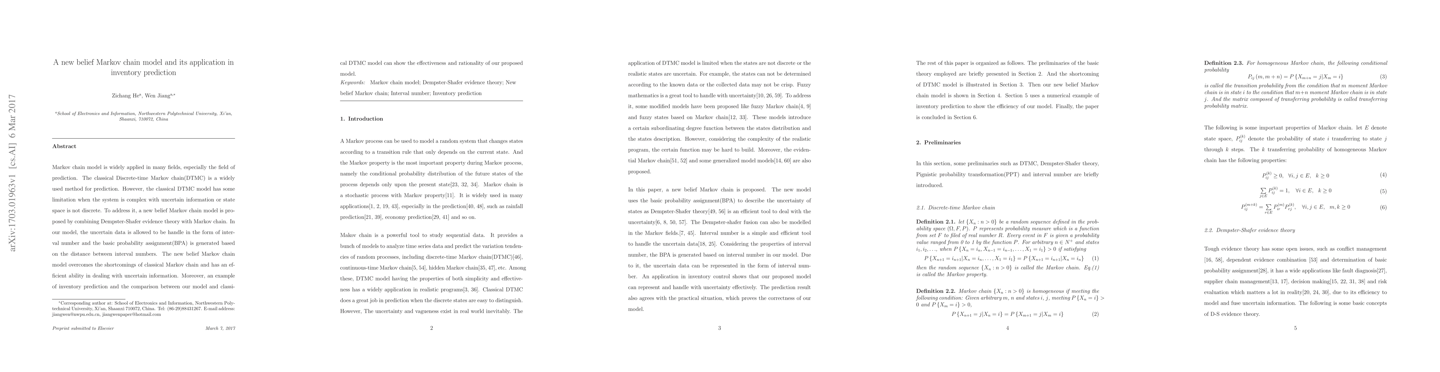 The paper proposes a new belief Markov chain model that integrates Dempster-Shafer evidence theory to handle complex, uncertain systems, surpassing the limitations of classical Discrete-time Markov chains. The model demonstrates effectiveness in inventory prediction, outperforming the classical DTMC model.