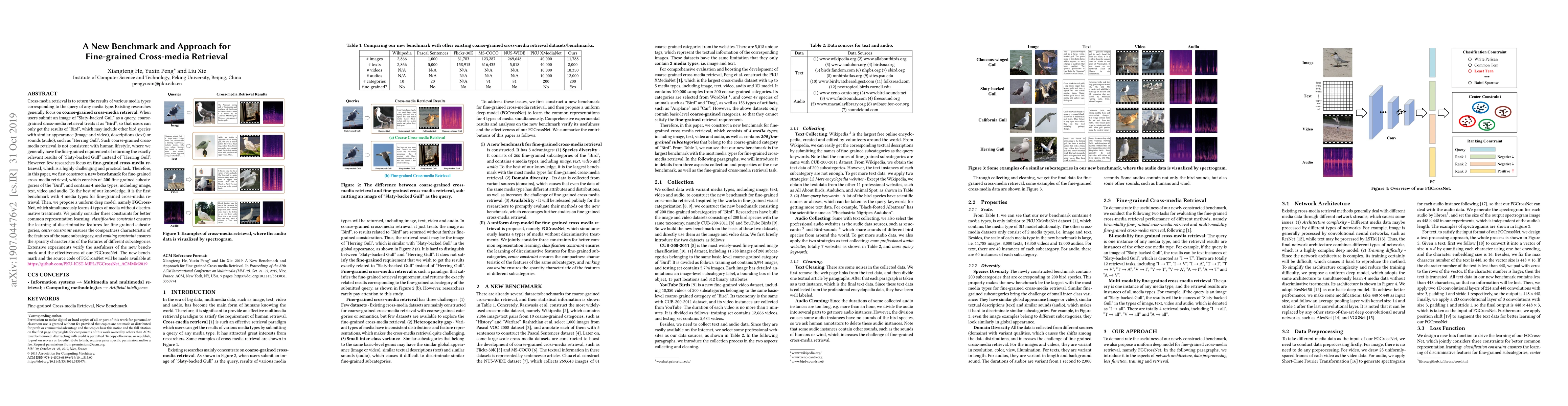 This paper introduces a new benchmark for fine-grained cross-media retrieval, focusing on 200 subcategories of "Bird" across four media types: image, text, video, and audio. It also proposes FGCrossNet, a deep model that learns discriminative features through classification, compactness via center constraints, and sparsity through ranking constraints, demonstrating its effectiveness in fine-grained retrieval tasks.