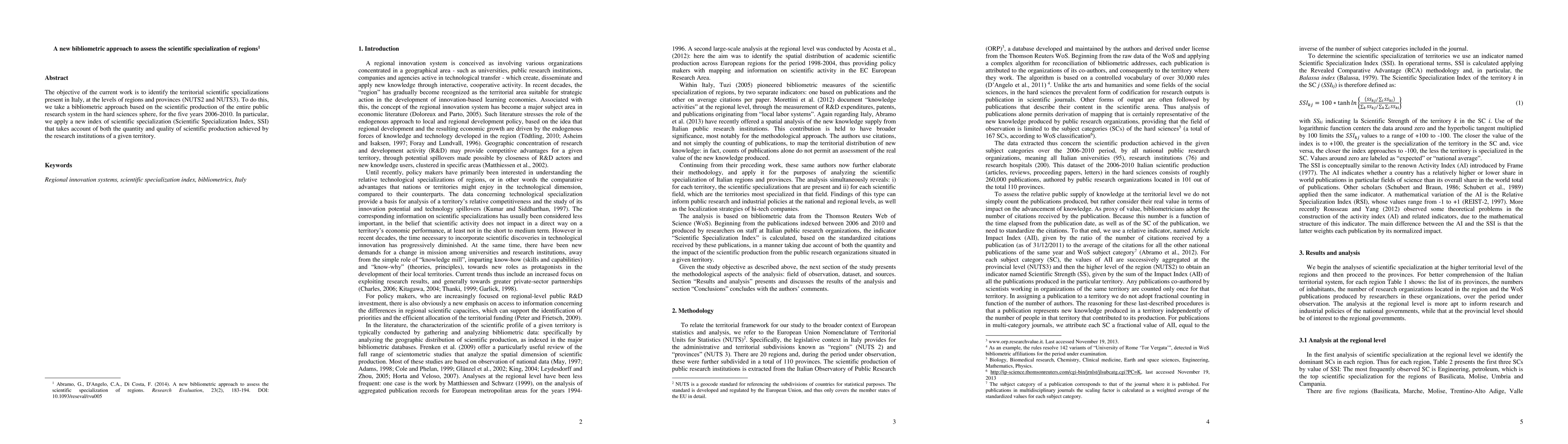 This paper introduces a new bibliometric approach to evaluate the scientific specialization of Italian regions and provinces using the Scientific Specialization Index (SSI) based on the quantity and quality of scientific output from public research institutions in the hard sciences from 2006-2010. The study aims to identify territorial scientific specializations at NUTS2 and NUTS3 levels.