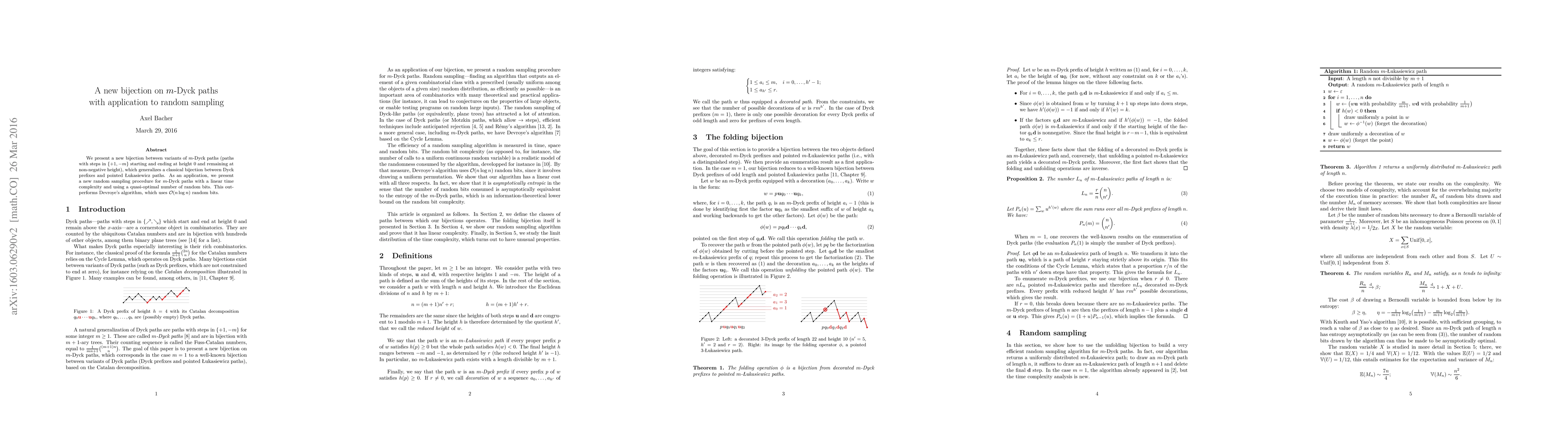 This paper introduces a novel bijection between variants of $m$-Dyck paths, extending a classical bijection, and proposes a new random sampling method for $m$-Dyck paths with linear time complexity and quasi-optimal random bit usage, outperforming Devroye's algorithm.