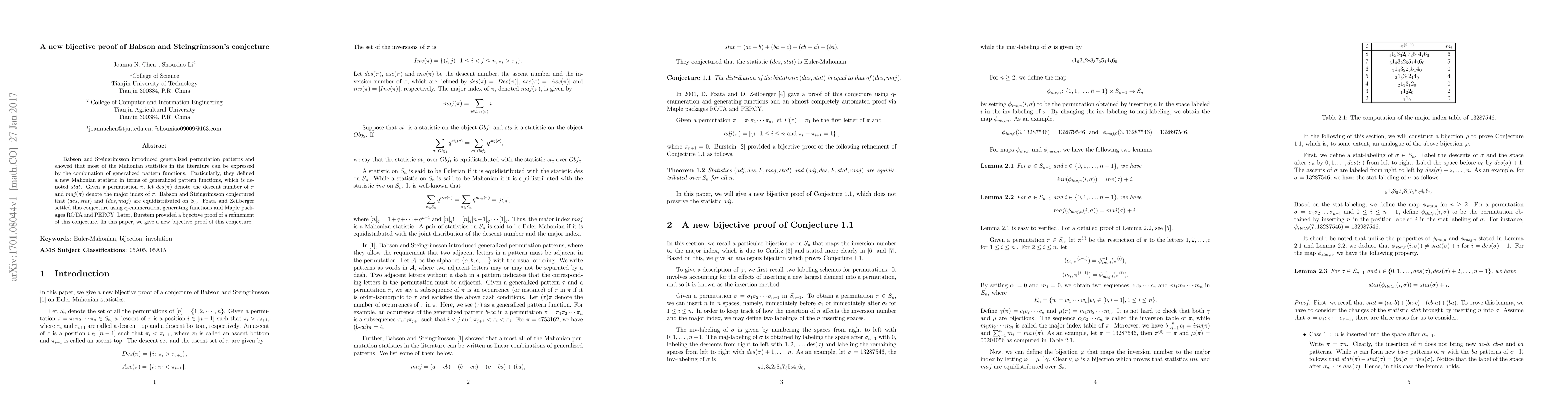 This paper presents a new bijective proof for Babson and Steingr\'{\i}msson's conjecture, which asserts the equidistribution of $(des,stat)$ and $(des,maj)$ on the symmetric group $S_n$. The authors provide an alternative bijective approach to the previously established proof by Burstein.