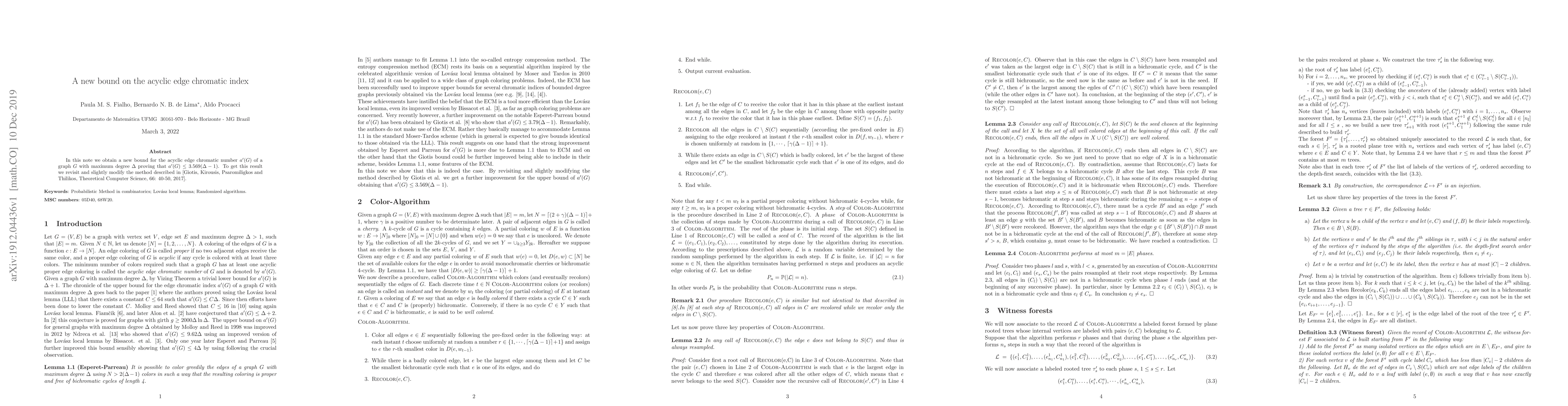 This paper establishes a new upper bound for the acyclic edge chromatic number $a'(G)$ of a graph $G$, showing that $a'(G) \leq 3.569(D-1)$ for graphs with maximum degree $D$. The result refines a previously described method from [Giotis et al., Theoretical Computer Science, 2017].