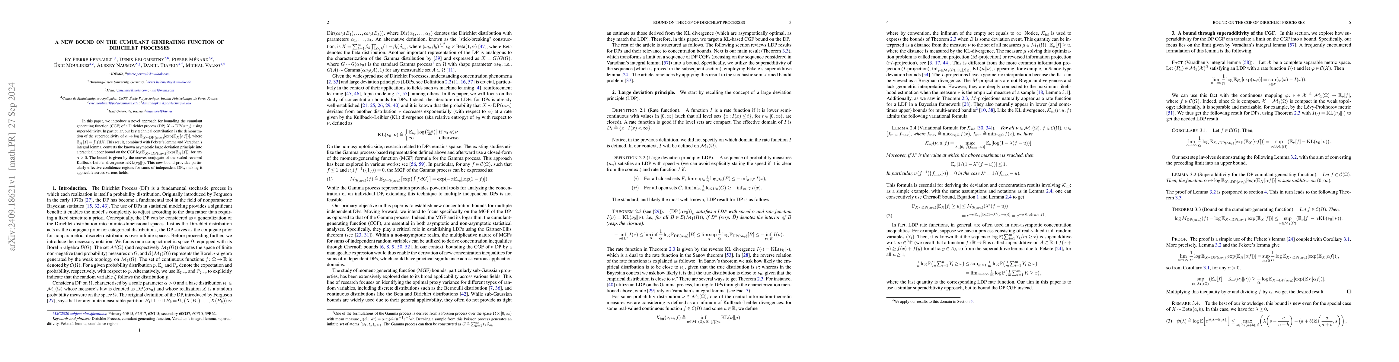 This paper presents a novel upper bound on the cumulant generating function of Dirichlet processes using superadditivity. The key result leverages the superadditivity of a function of α to derive a practical bound, which is the convex conjugate of the scaled reversed Kullback-Leibler divergence, enhancing the understanding and application in confidence regions for sums of independent Dirichlet processes.