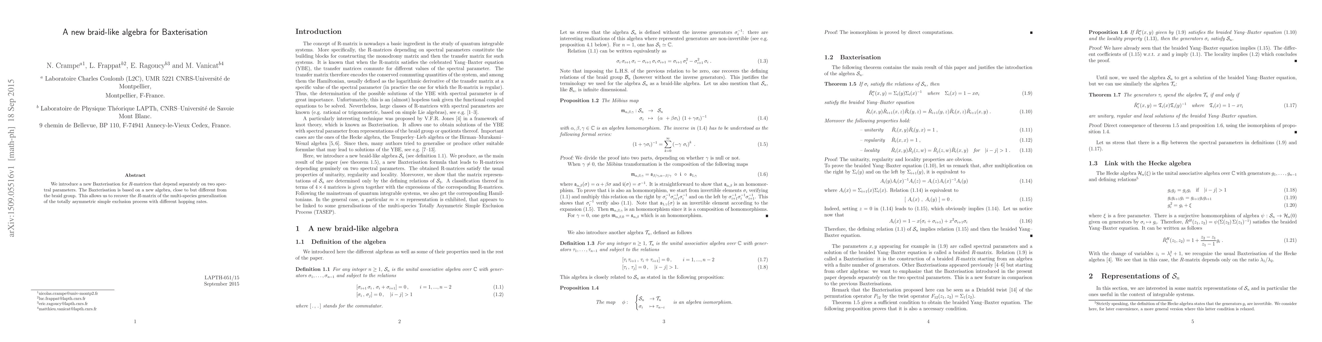 We introduce a new Baxterisation for R-matrices that depend separately on two spectral parameters. The Baxterisation is based on a new algebra, close to but different from the braid group. This allows us to recover the R-matrix of the multi-species generalization of the totally asymmetric simple exclusion process with different hopping rates.