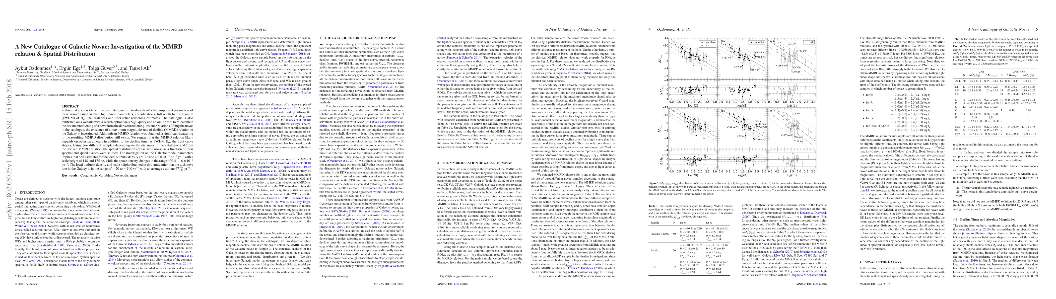 This study introduces a new Galactic novae catalogue with detailed parameters and investigates the MMRD relation and spatial distribution of novae. While an MMRD relation was found, significant scattering suggests dependence on additional factors like FWHM H$_\alpha$ and light curve shapes. The spatial distribution analysis indicates a local outburst density of $3.6 - 4.2 \times 10^{-10}$ pc$^{-3}$ yr$^{-1}$ and a disk nova rate of $\sim20$ to $\sim100$ yr$^{-1}$.