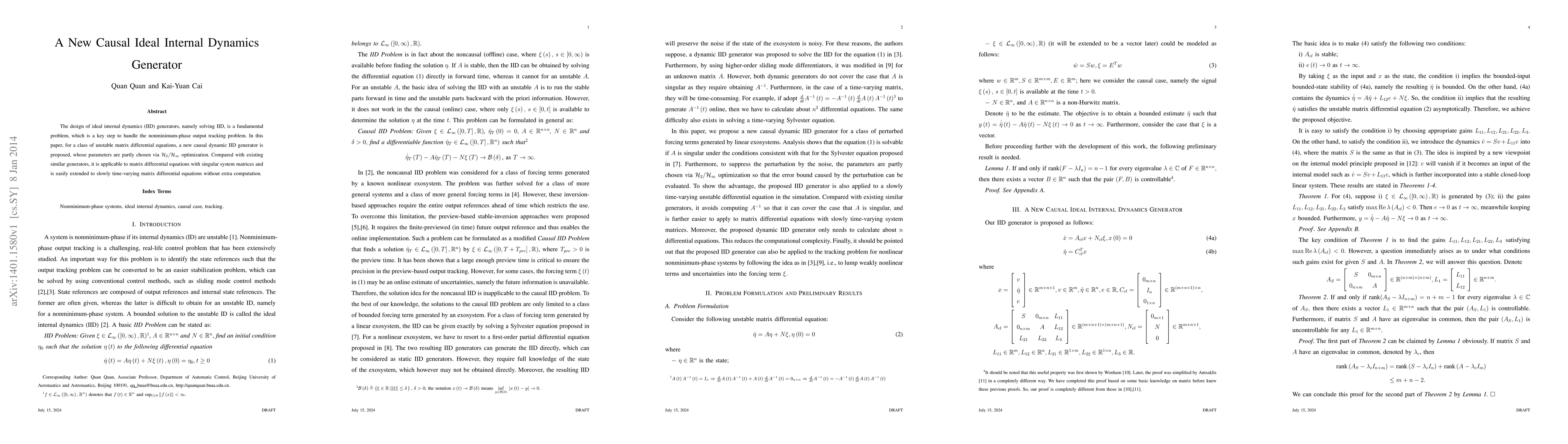 The design of ideal internal dynamics (IID) generators, namely solving IID, is a fundamental problem, which is a key step to handle the nonminimum-phase output tracking problem. In this paper, for a class of unstable matrix differential equations, a new causal dynamic IID generator is proposed, whose parameters are partly chosen via H_2/H_inf optimization. Compared with existing similar generators, it is applicable to matrix differential equations with singular system matrices and is easily extended to slowly time-varying matrix differential equations without extra computation.
