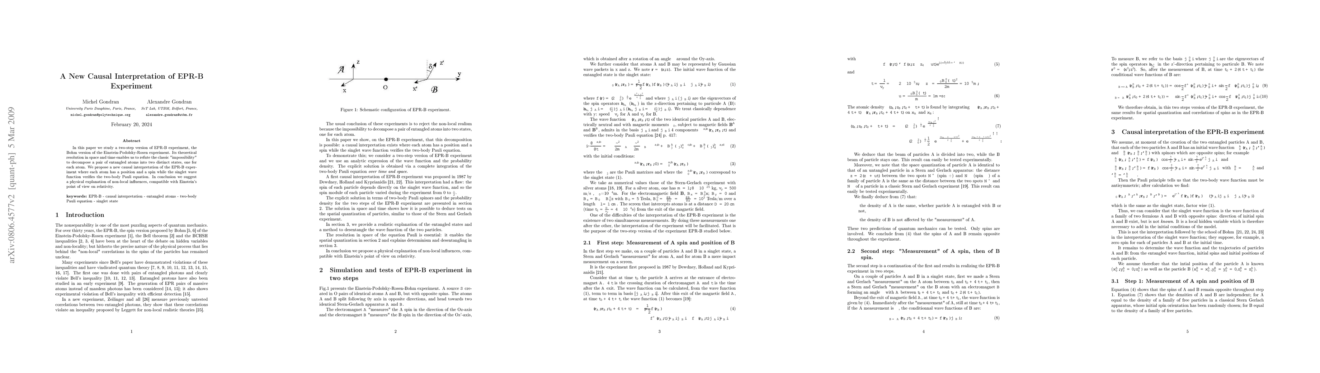 The paper studies a two-step version of the EPR-B experiment, proposing a new causal interpretation where each atom has a position and spin, and the singlet wave function adheres to the two-body Pauli equation.