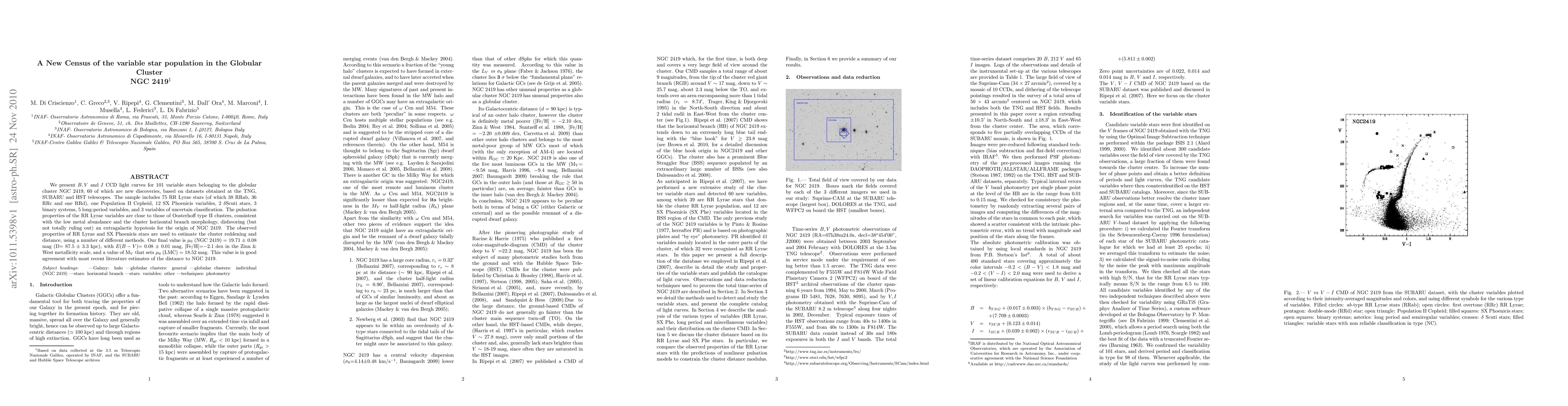 We present B, V and I CCD light curves for 101 variable stars belonging to the globular cluster NGC2419, 60 of which are new discoveries, based on datasets obtained at the TNG, SUBARU and HST telescopes. The sample includes 75 RR Lyrae stars (of which 38 RRab, 36 RRc and one RRd), one Population II Cepheid, 12 SX Phoenicis variables, 2 DeltaScuti stars, 3 binary systems, 5 long-period variables, and 3 variables of uncertain classification. The pulsation properties of the RR Lyrae variables are close to those of Oosterhoff type II clusters, consistent with the low metal abundance and the cluster horizontal branch morphology,disfavoring (but not totally ruling out) an extragalactic hypotesis for the origin of NGC2419. The observed properties of RR Lyrae and SX Phoenicis stars are used to estimate the cluster reddening and distance, using a number of different methods. Our final value is mo(NGC2419)=19.71+/-0.08mag (D= 87.5+/-3.3kpc), with E(B-V)=0.08+/-0.01mag, [Fe/H]=-2.1dex in the Zinn & West metallicity scale, and a value of Mv that sets mo(LMC)=18.52mag. This value is in good agreement with most recent literature estimates of the distance to NGC 2419.