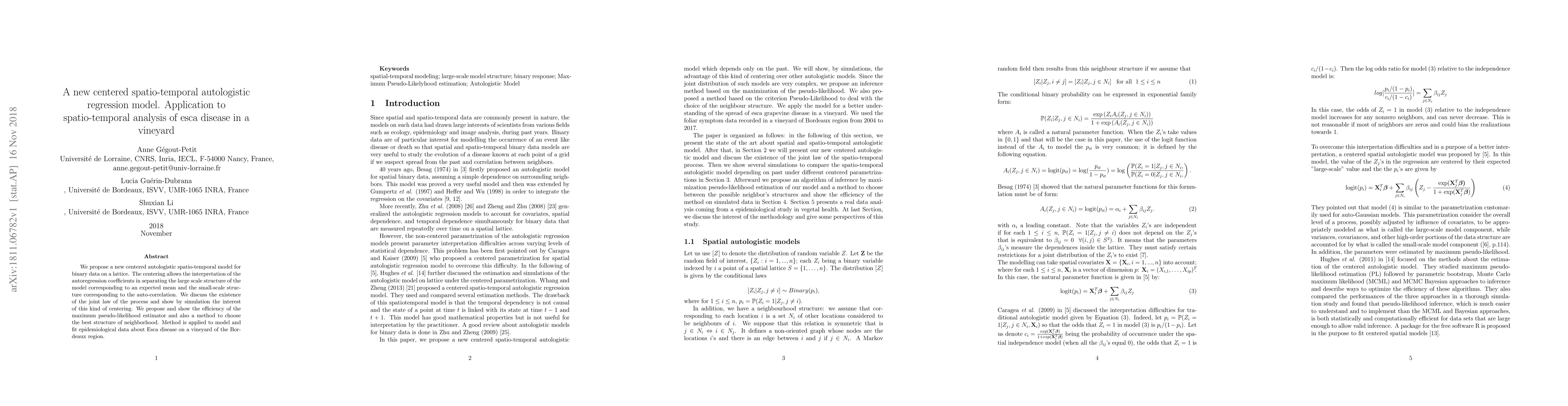We propose a new centered autologistic spatio-temporal model for binary data on a lattice. The centering allows the interpretation of the autoregression coefficients in separating the large scale structure of the model corresponding to an expected mean and the small-scale structure corresponding to the auto-correlation. We discuss the existence of the joint law of the process and show by simulation the interest of this kind of centering. We propose and show the efficiency of the maximum pseudo-likelihood estimator and also a method to choose the best structure of neighborhood. Method is applied to model and fit epidemiological data about Esca disease on a vineyard of the Bordeaux region.