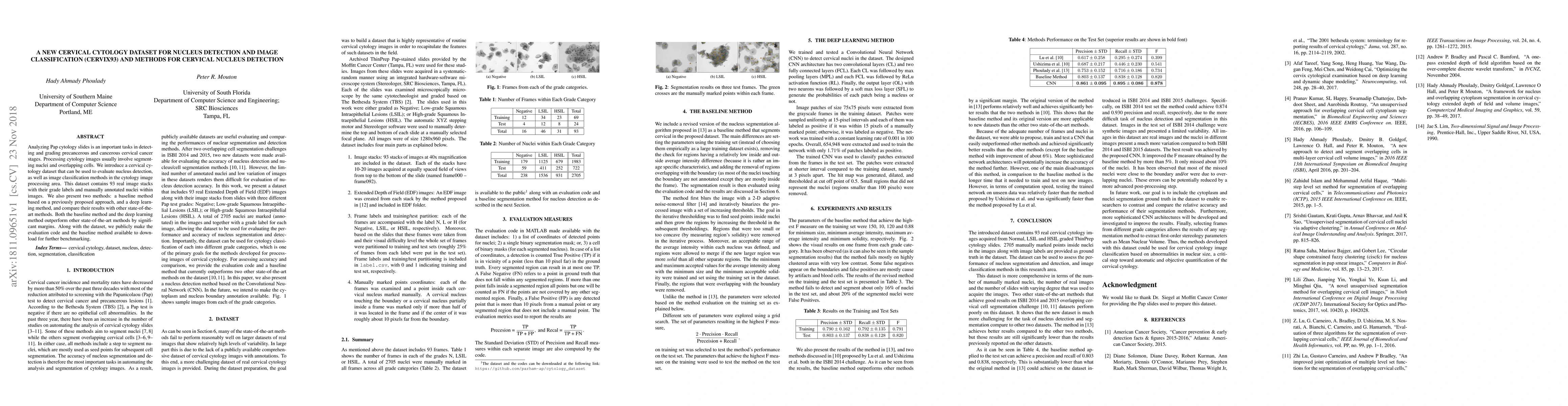 This paper introduces the Cervix93 dataset, a new cervical cytology dataset for nucleus detection and image classification, containing 93 image stacks with grade labels and annotated nuclei. The authors propose two detection methods, a baseline and a deep learning approach, both outperforming existing state-of-the-art methods. The dataset, evaluation code, and baseline method are made publicly available for further research.