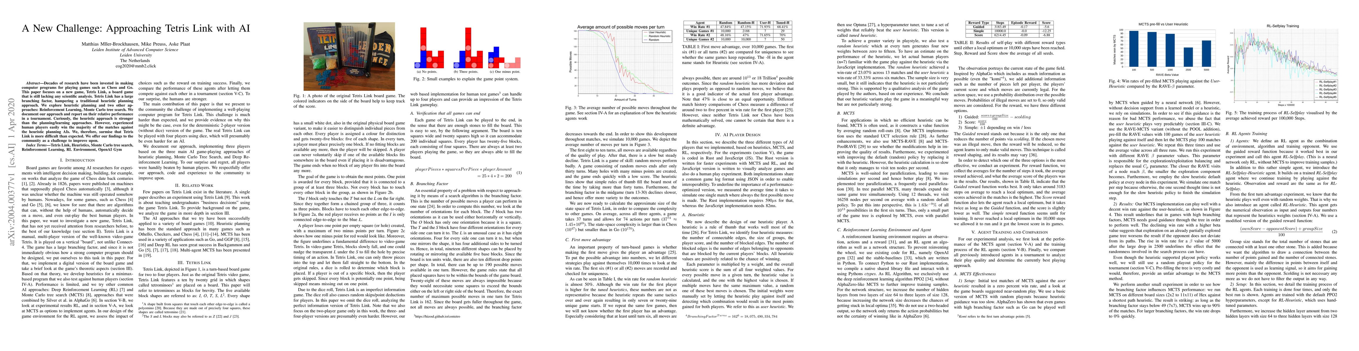 Decades of research have been invested in making computer programs for playing games such as Chess and Go. This paper focuses on a new game, Tetris Link, a board game that is still lacking any scientific analysis. Tetris Link has a large branching factor, hampering a traditional heuristic planning approach. We explore heuristic planning and two other approaches: Reinforcement Learning, Monte Carlo tree search. We document our approach and report on their relative performance in a tournament. Curiously, the heuristic approach is stronger than the planning/learning approaches. However, experienced human players easily win the majority of the matches against the heuristic planning AIs. We, therefore, surmise that Tetris Link is more difficult than expected. We offer our findings to the community as a challenge to improve upon.