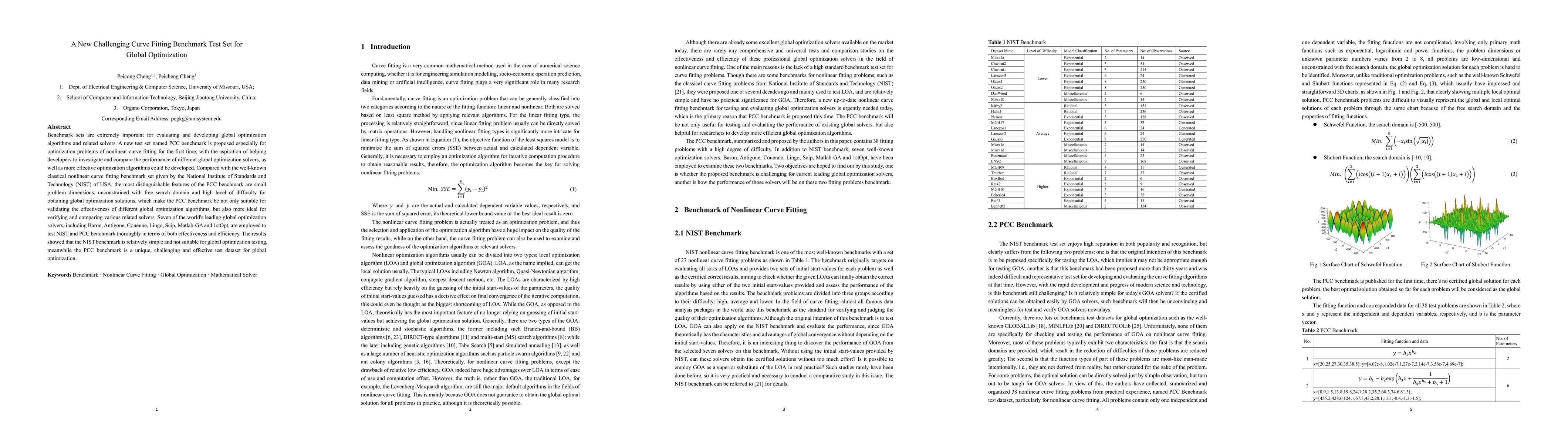 The paper introduces a new PCC benchmark test set for evaluating global optimization algorithms in nonlinear curve fitting, emphasizing its small problem dimensions, high difficulty, and unconstrained nature. Comparative tests with seven leading solvers show that the PCC benchmark is more challenging and effective than the classical NIST benchmark.