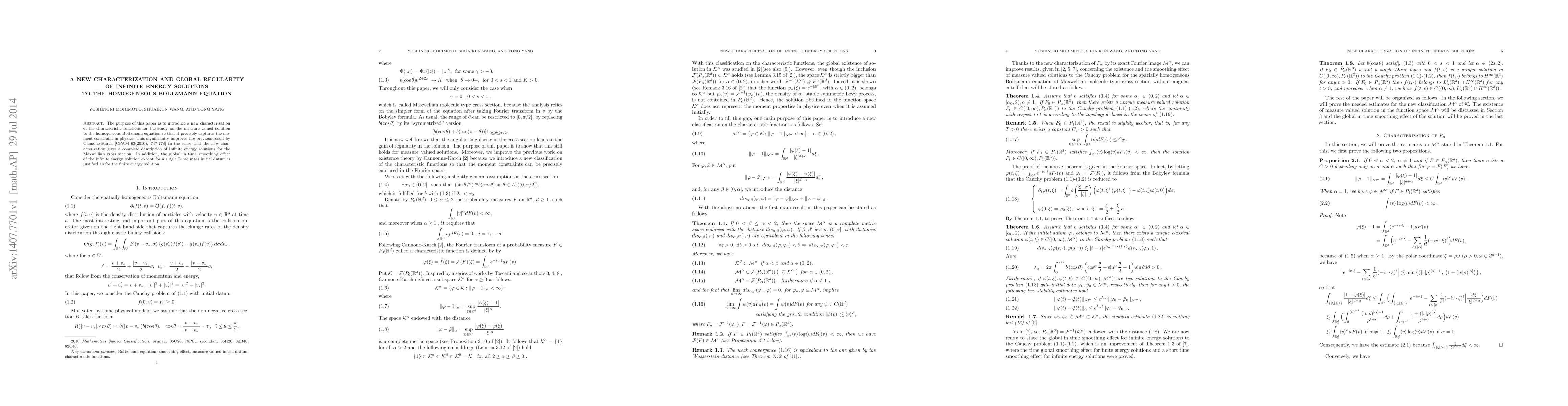The purpose of this paper is to introduce a new characterization of the characteristic functions for the study on the measure valued solution to the homogeneous Boltzmann equation so that it precisely captures the moment constraint in physics. This significantly improves the previous result by Cannone-Karch [CPAM 63(2010), 747-778] in the sense that the new characterization gives a complete description of infinite energy solutions for the Maxwellian cross section. In addition, the global in time smoothing effect of the infinite energy solution except for a single Dirac mass initial datum is justified as for the finite energy solution.